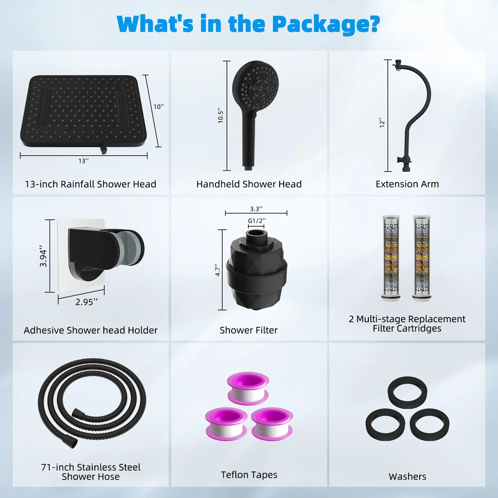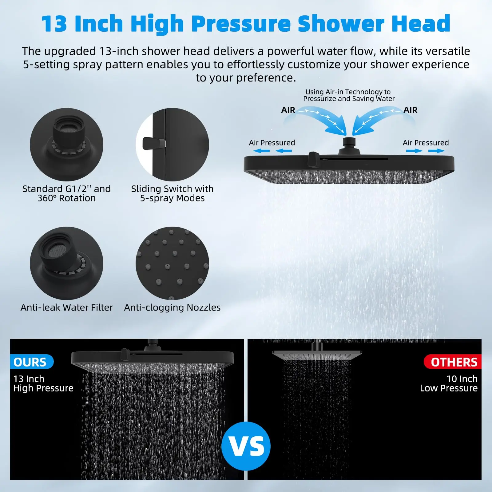 Β·20 Stages Shower Filter for Showerhead: This 13'' large rain shower head has 157 splash jets that provide a luxurious rain spray that envelops your body with full drops, providing a dynamic high-pressure massage experience. The shower filter with 20-stage water filtration, redox media, calcium sulfite, activated carbon, and ceramic beads provides the ultimate water purification, which eliminates odours, balances pH levels, and infuses beneficial minerals into your skin, nails, and hair