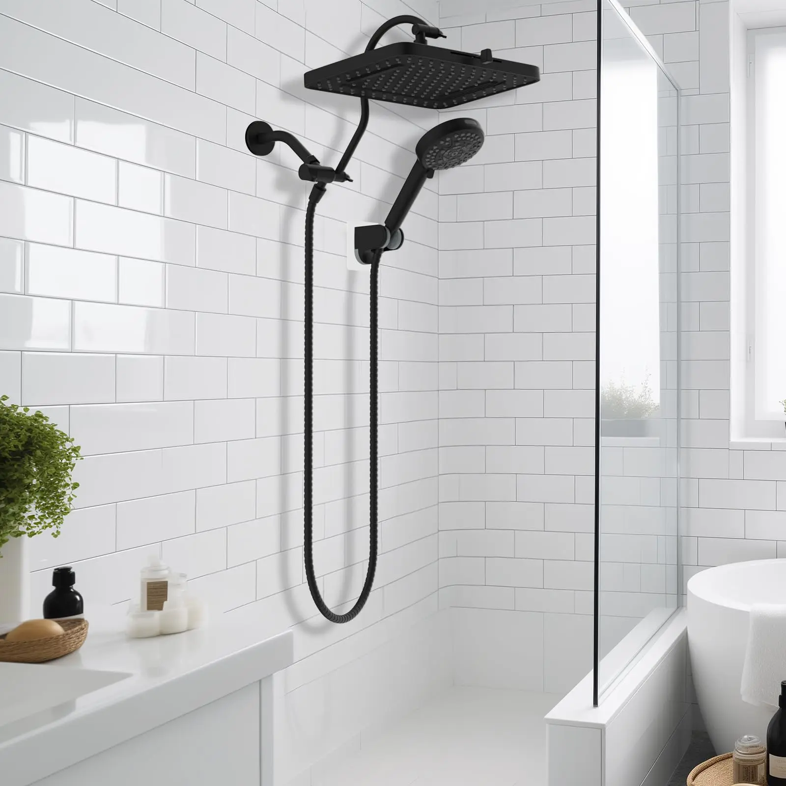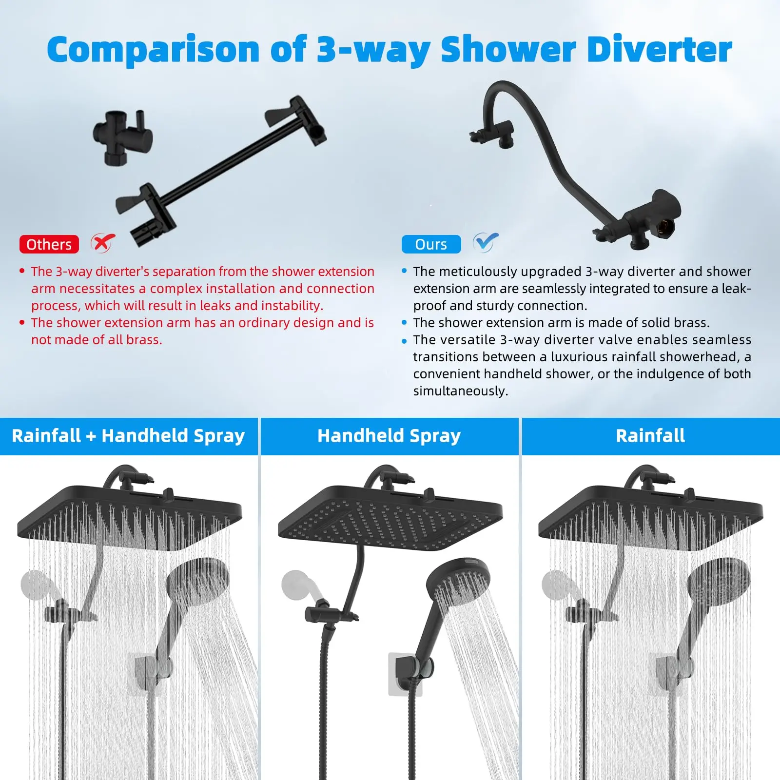 Β·Upgraded 3-Way Diverter Valve: This shower head combo is effortlessly installed without tools or a plumber. The 3-way diverter offers the flexibility to use the shower head or rainfall shower head alone or enjoy them both simultaneously. Our 3-way diverter and shower extension arm are designed to connect without leaking or shaking. In contrast, an ordinary 3-way diverter requires separate installation and connection to the extension arm, leading to potential leaks and instability