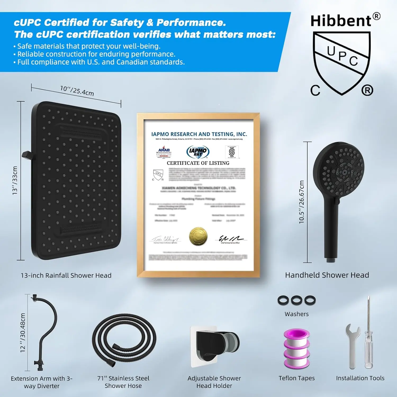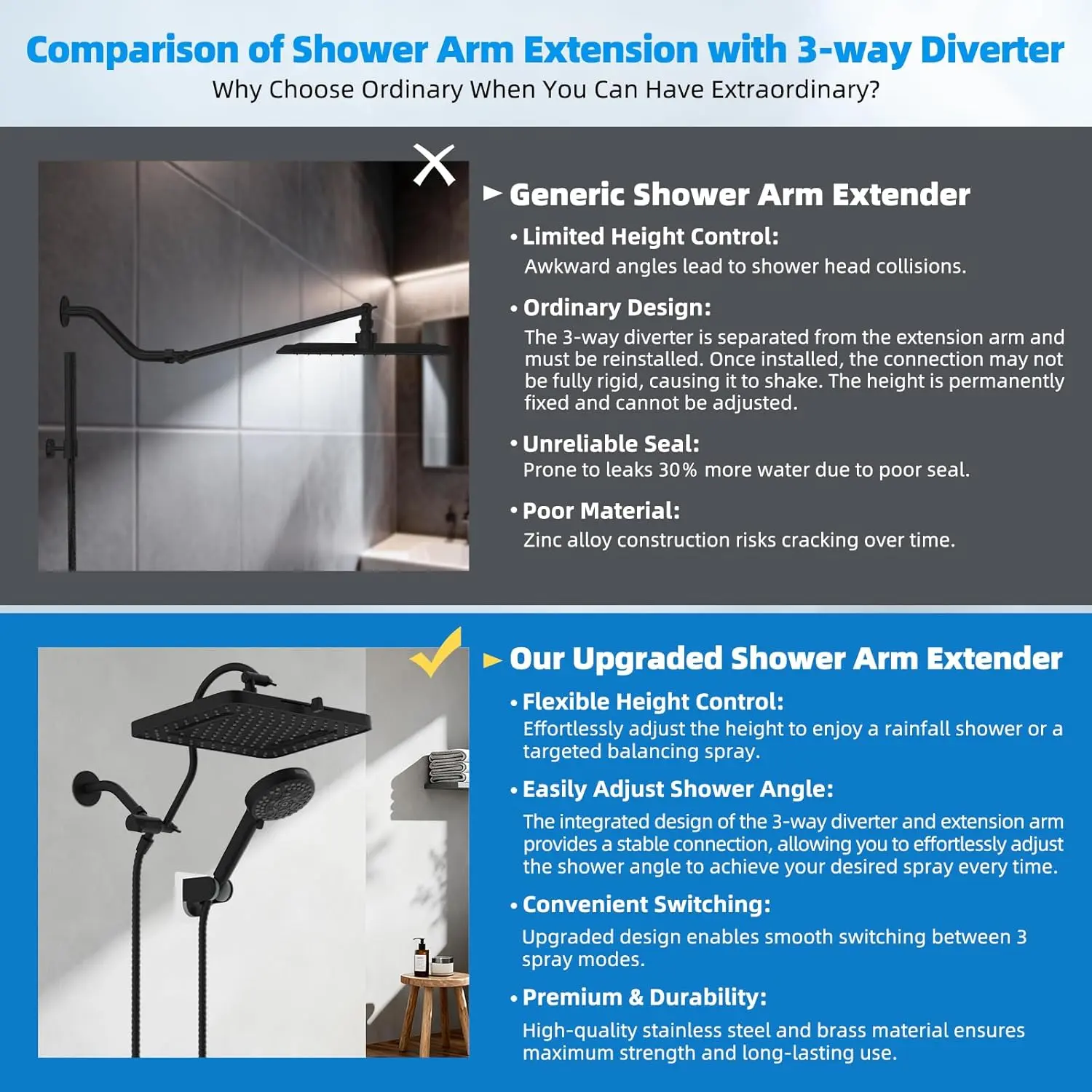 Β·Upgraded 12'' Extension Arm: The height and angle adjustable, curved design enhances its bearing capacity, allowing you to raise the shower head to achieve a vertical water. Compared to a regular shower arm extender, the Hibbent's shower arm extension can raise or lower the shower head, and maintain it in a continuous horizontal position. This ensures the shower head remains perfectly vertical, without colliding with the arm, instead of sloping water like an ordinary straight shower arm extender