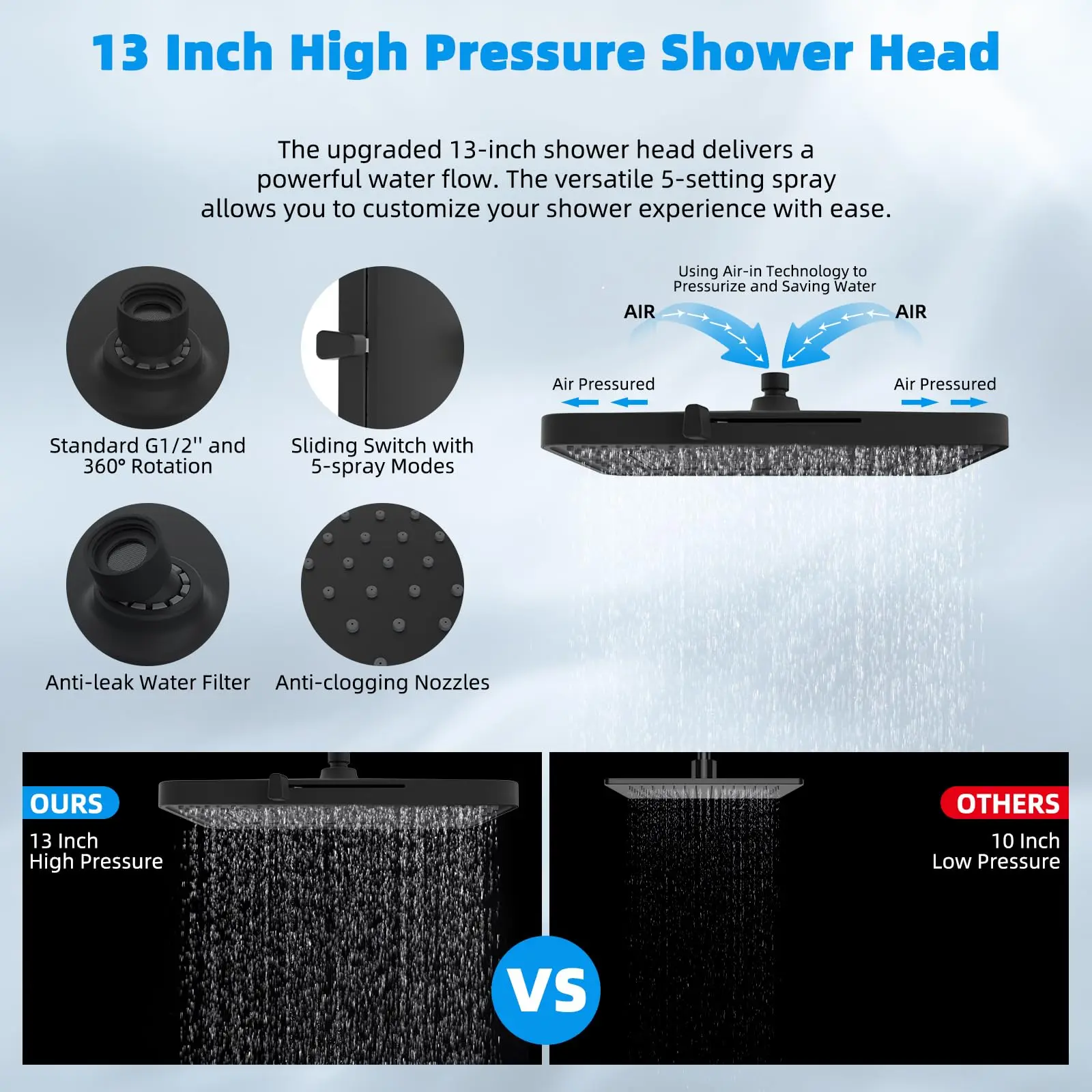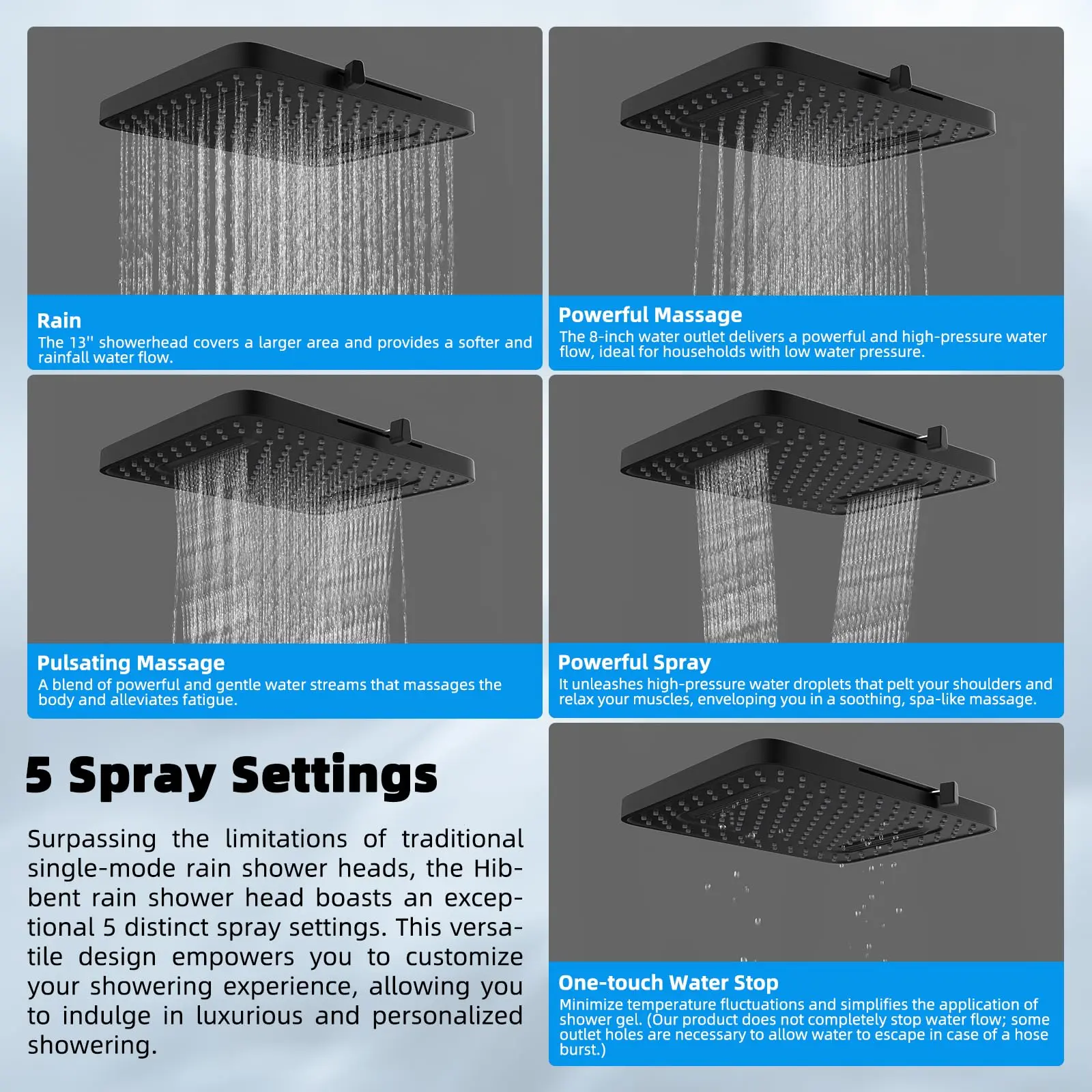 Β·Upgraded Rainfall Shower Head: This 13-inch rain shower head has 157 splash jets that provide a luxurious rain spray that envelops your body with full drops, providing a dynamic high-pressure massage experience even at low water pressure levels. Versatile 5-setting design enables you to effortlessly transition between 5 sprays to indulge in a comfortable cleansing shower tailored to your every preference