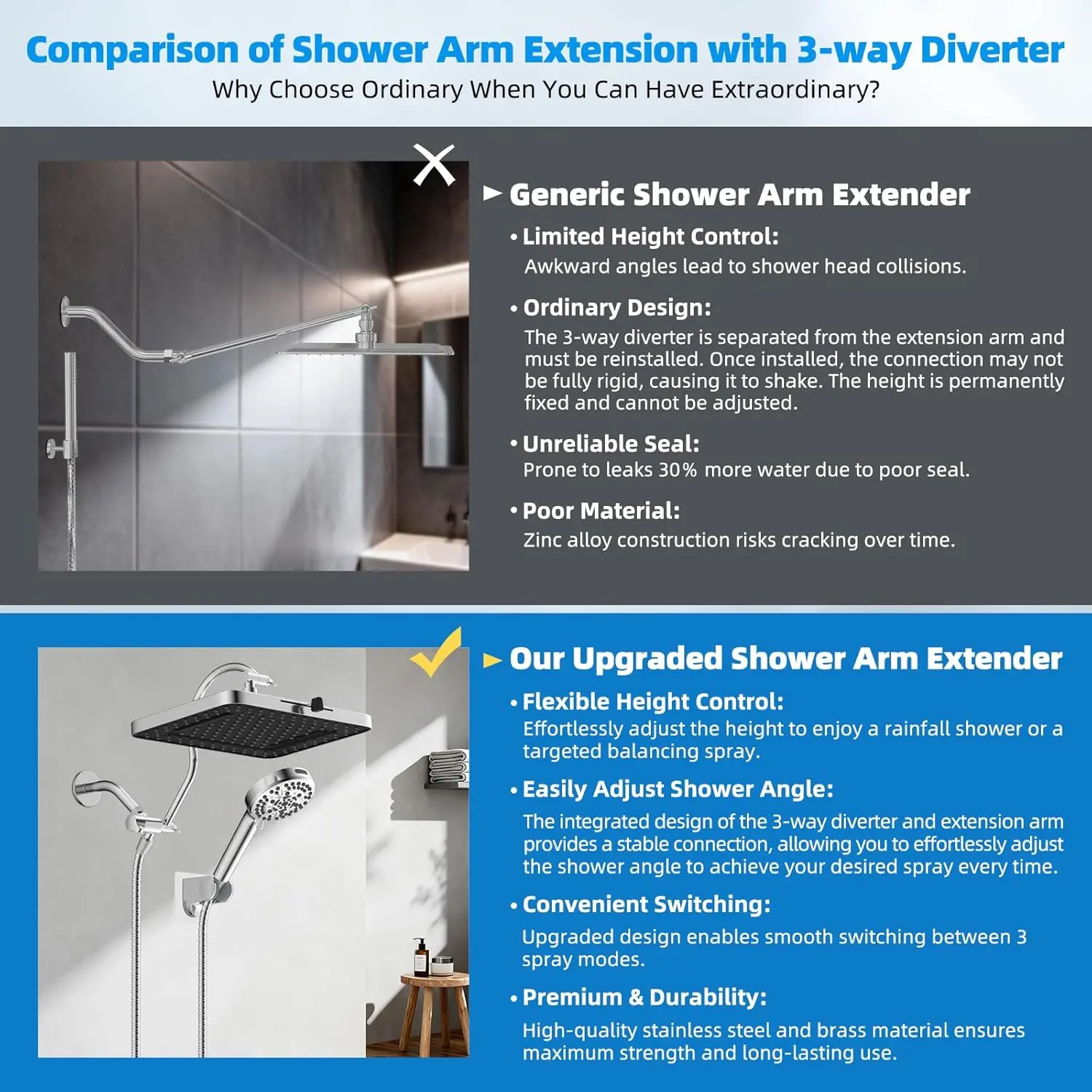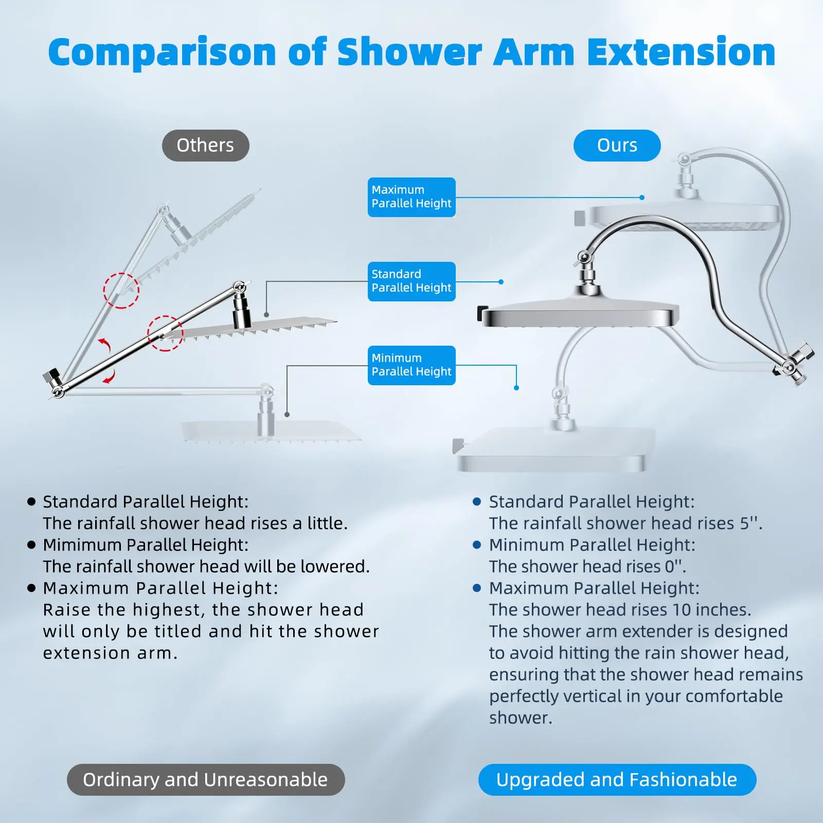 ¡Upgraded 12'' Extension Arm: The height and angle adjustable, curved design enhances its bearing capacity, allowing you to raise the shower head to achieve a vertical water. Compared to a regular shower arm extender, the Hibbent's shower arm extension can raise or lower the shower head, and maintain it in a continuous horizontal position. This ensures the shower head remains perfectly vertical, without colliding with the arm, instead of sloping water like an ordinary straight shower arm extender