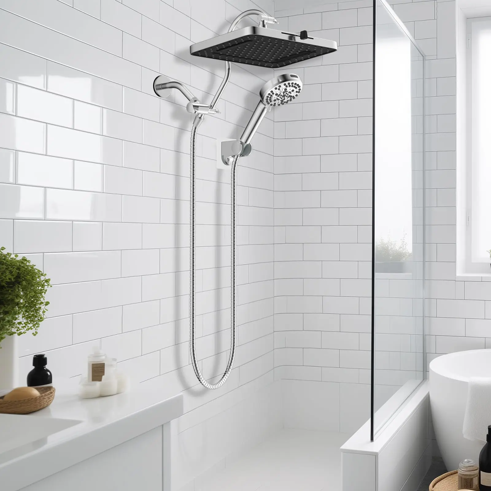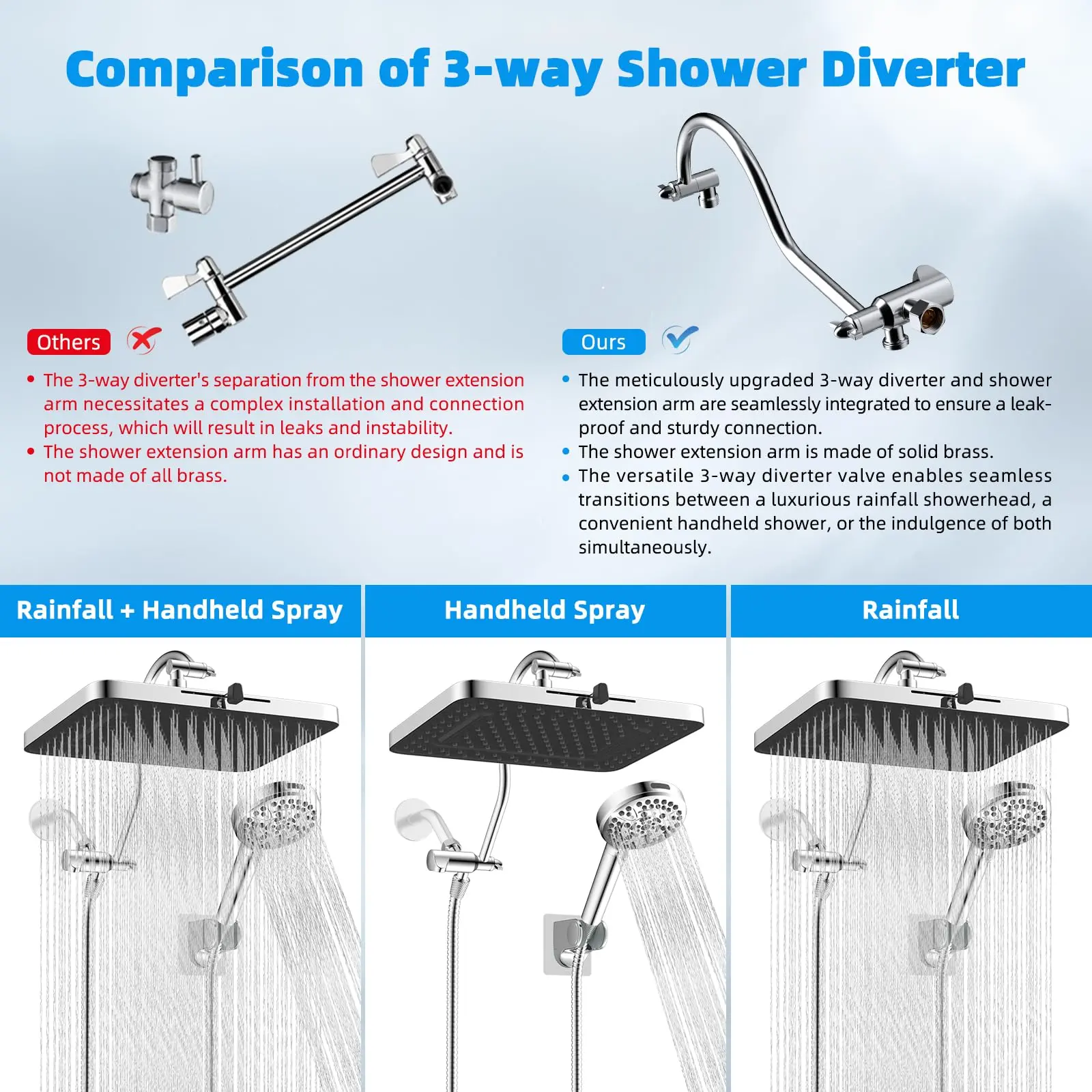 ¡Upgraded 3-Way Diverter Valve: This shower head combo is effortlessly installed without tools or a plumber. The 3-way diverter offers the flexibility to use the shower head or rainfall shower head alone or enjoy them both simultaneously. Our 3-way diverter and shower extension arm are designed to connect without leaking or shaking. In contrast, an ordinary 3-way diverter requires separate installation and connection to the extension arm, leading to potential leaks and instability