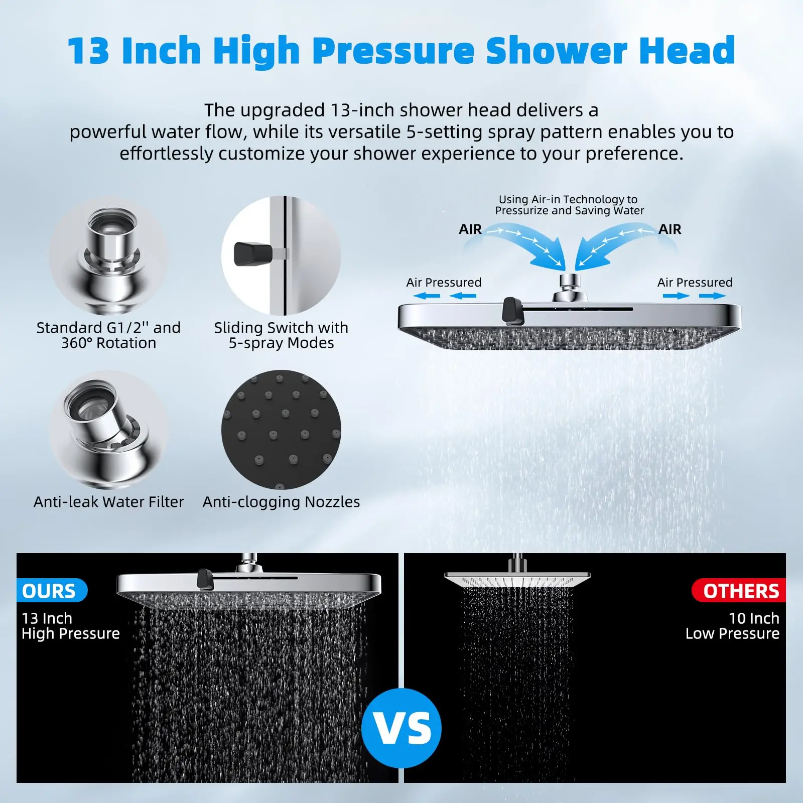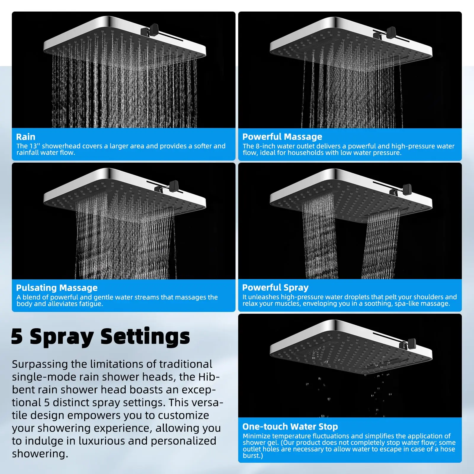 ¡Upgraded Rainfall Shower Head: This 13-inch rain shower head has 157 splash jets that provide a luxurious rain spray that envelops your body with full drops, providing a dynamic high-pressure massage experience even at low water pressure levels. Versatile 5-setting design enables you to effortlessly transition between 5 sprays to indulge in a comfortable cleansing shower tailored to your every preference
