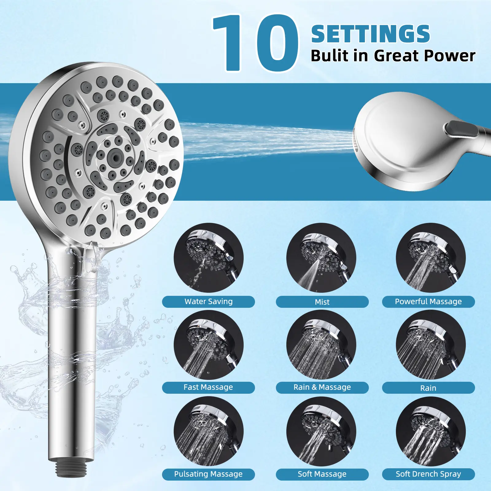 ¡Powerful 10 Spray Settings: The Hibbent high-pressure handheld shower head offers a diverse array of 10 settings, delivering a personalized shower experience. Its wide fan mode efficiently cleans large areas. This versatile shower head proves to be a valuable tool for cleaning tubs, tiles, and even pets