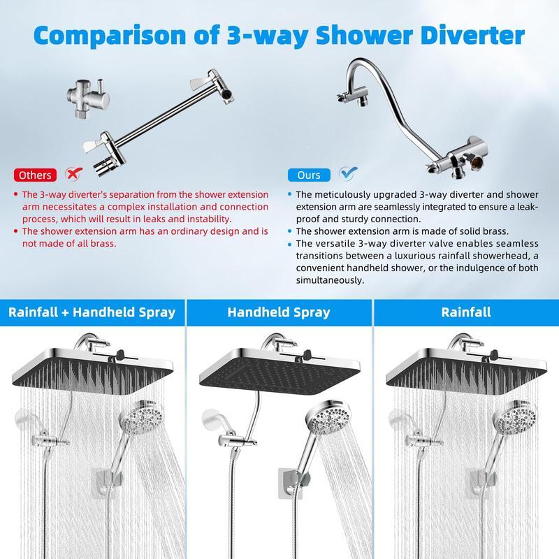 ·Upgraded 3-Way Diverter Valve: This shower head combo is effortlessly installed without tools or a plumber. The 3-way diverter offers the flexibility to use the shower head or rainfall shower head alone or enjoy them both simultaneously. Our 3-way diverter and shower extension arm are designed to connect without leaking or shaking. In contrast, an ordinary 3-way diverter requires separate installation and connection to the extension arm, leading to potential leaks and instability