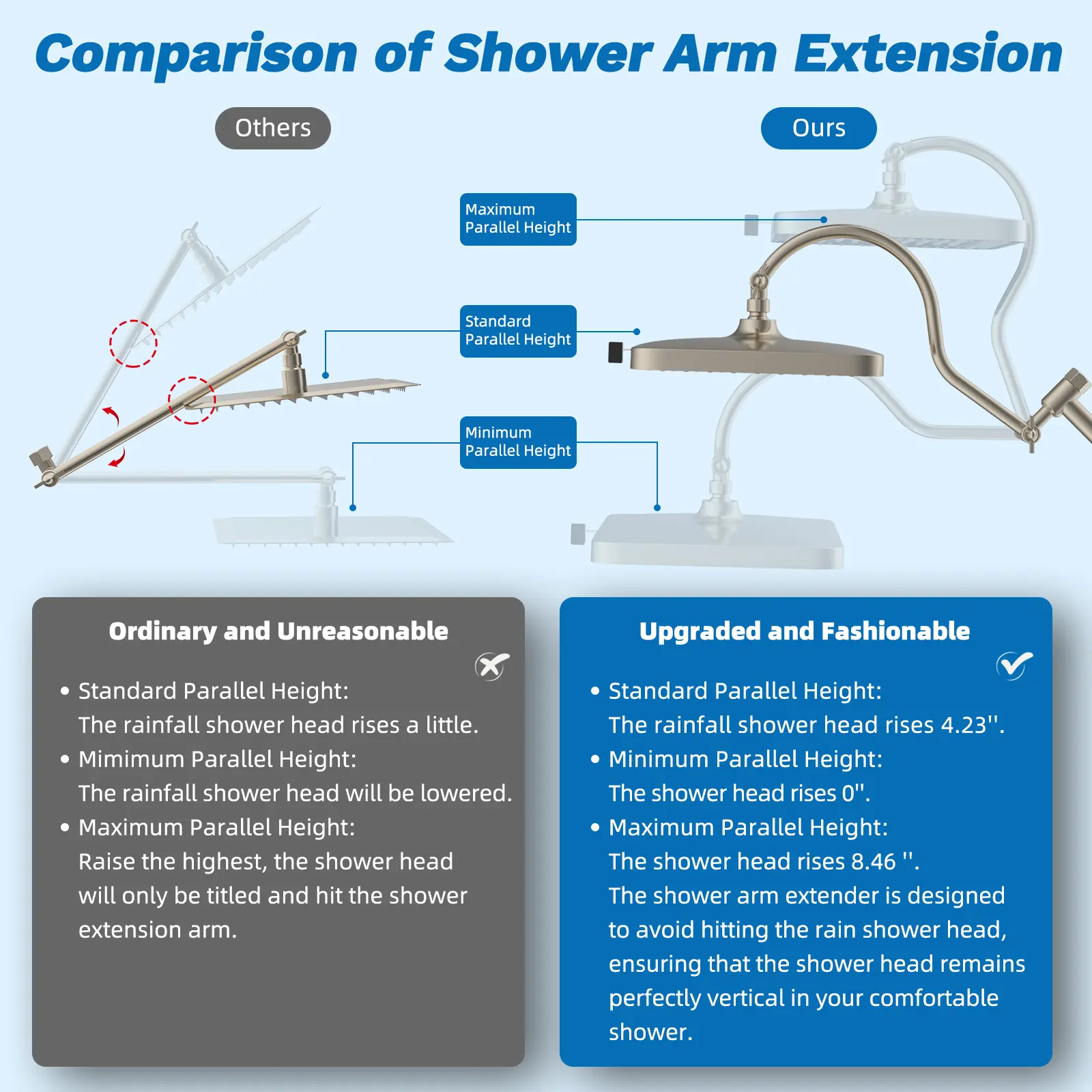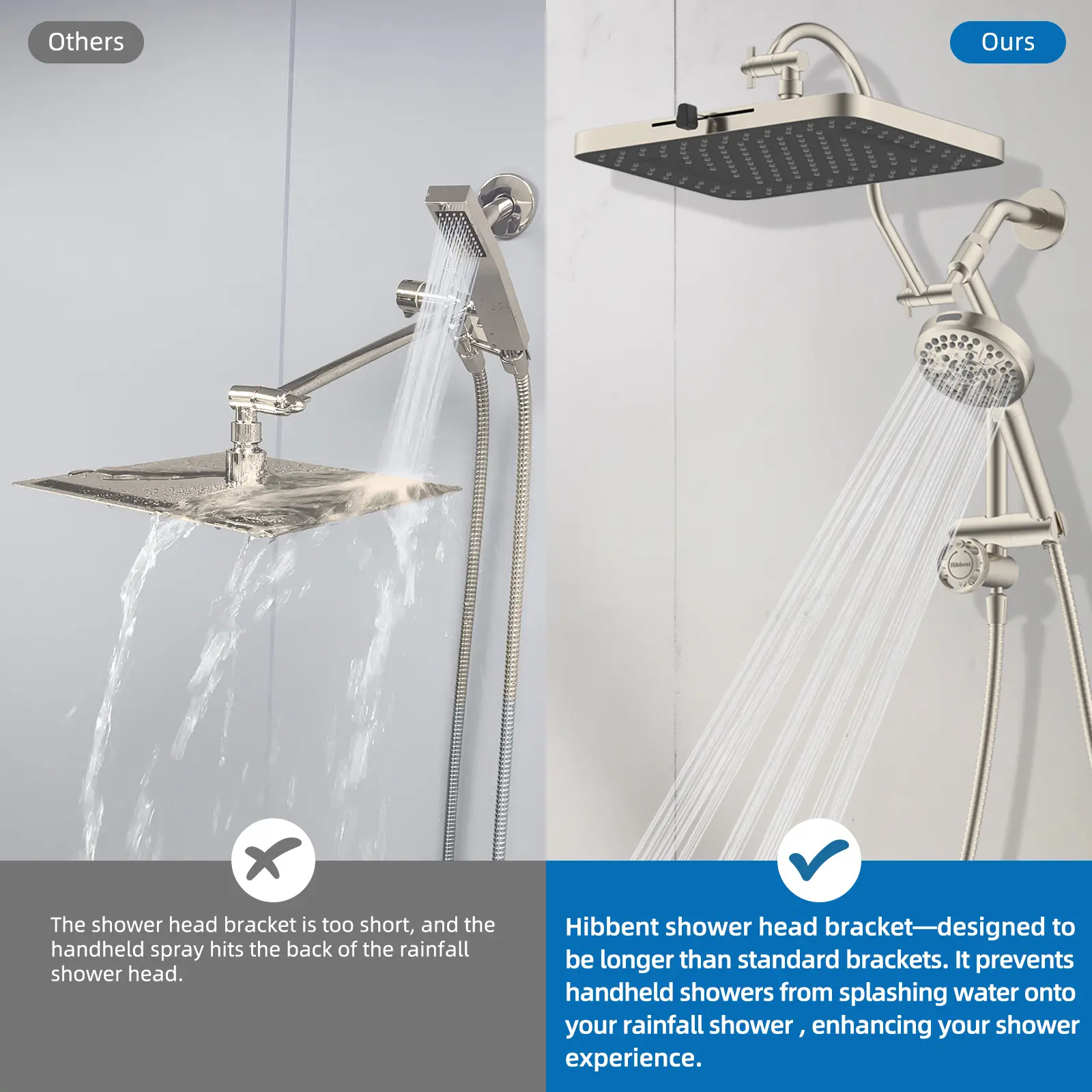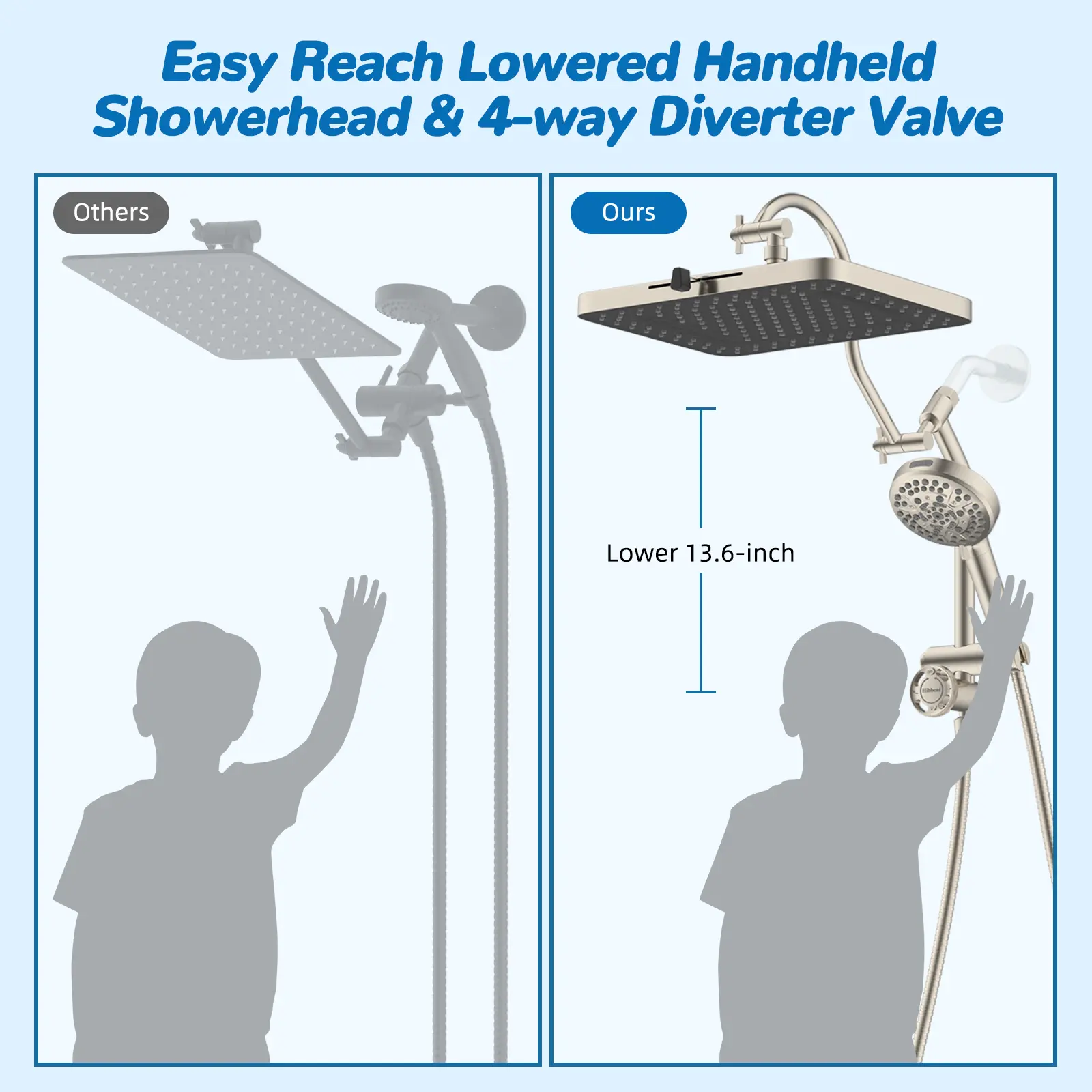 ·[Upgraded Integrated Curvered Shape Extension Arm] The integrated shower extension arm ensures a tight seal, preventing any water leaks and guaranteeing safe water usage. Unlike standard shower arm extenders, the Hibbent shower arm equiped with upgraded curved shape shower arm which allows you to raise or lower the shower head while keeping it in a horizontal position, preventing any collisions with the arm. The height-adjustable handheld shower head holder can be easily adjusted to accommodate different heights, which is designed for convenient use by everyone, including the elderly, children, adults, and wheelchair users