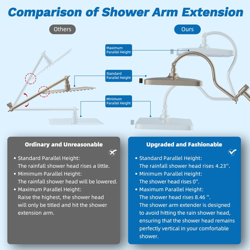 ·[Easy Reach 4 Way Diverter Shower Extension Arm] The innovative 4-way diverter shower arm is crafted from long-lasting all-metal material, ensuring strength while preventing leaks and wobbling with its integrated design. It offers a versatile combination of four spray modes: Handheld Spray, Rainfall Spray, Rainfall + Handheld Spray, and Pause Mode, catering to all your showering needs. The lowered 4 way diverter design is suitable for both adults and children, while the adjustable handheld holder allows for various angles and is longer than standard brackets, minimizing splashes and enhancing your overall shower experience