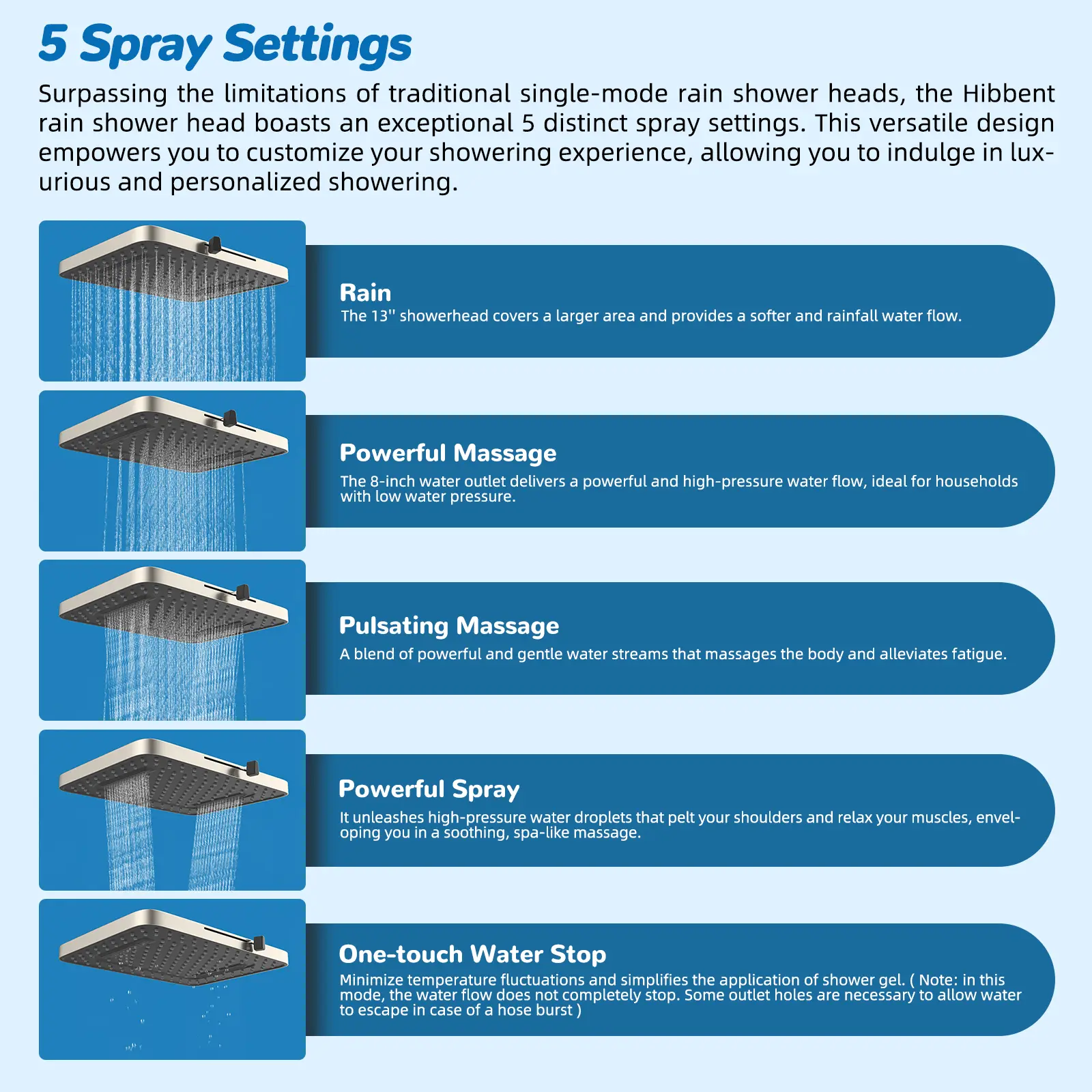 ·[Upgraded 5 Spray 13" Rainfall Shower Head] This 13”rain showerhead features 157 splash jets to offer greater coverage than traditional models. It delivers a dynamic, high-pressure massage experience, ensuring a lavish shower even in low-water pressure areas. Enjoy a soothing rain mode in gentle water flow, or switch to the 8-inch powerful massage mode for a revitalizing experience that eases sore muscles. The pulsating massage setting effectively reduces fatigue, while the shoulder massage feature targets tension with a focused spray for ultimate relaxation. Plus, the intuitive one-touch water stop minimizes temperature fluctuations, making it easy to apply shower gel or rinse off
