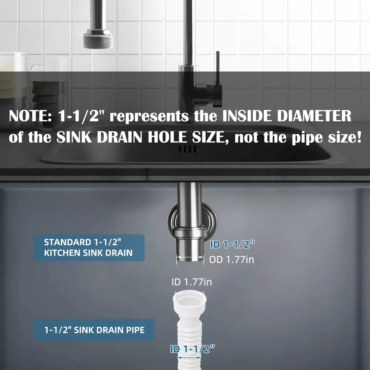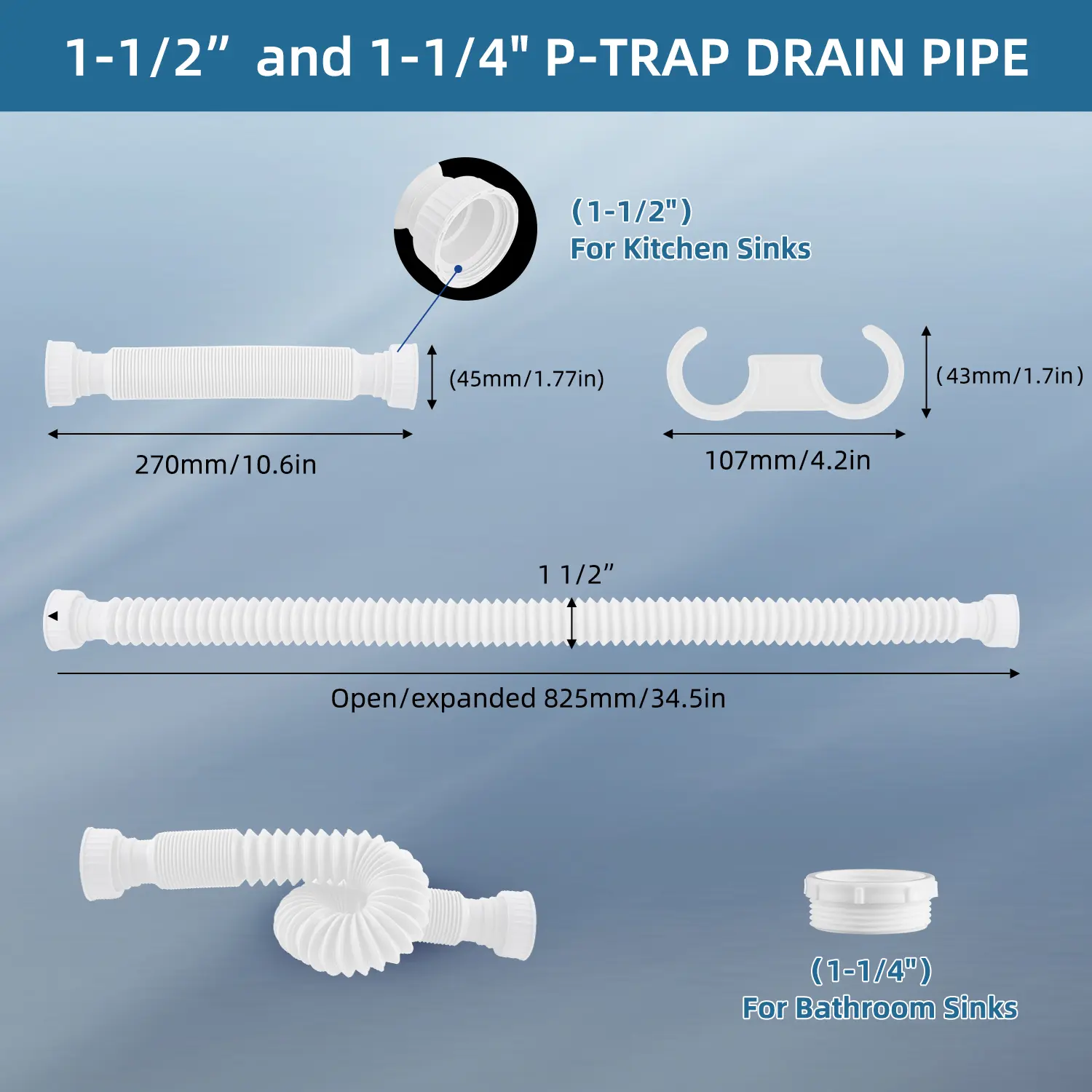 Adjustable and Flexible: The flexible drain pipe is specifically designed to fit 1-1/2" kitchen sink drain. Equipped with 1-1/4" adapter for bathroom sink drain. Its corrugated hose can expand and adjust effortlessly from 11" to 34.5". The drain pipe's nut has an inner diameter of 1.78". Flexible design allows you to easily bend and stretch it. NOTE: Before making your purchase, please ensure to check the size
