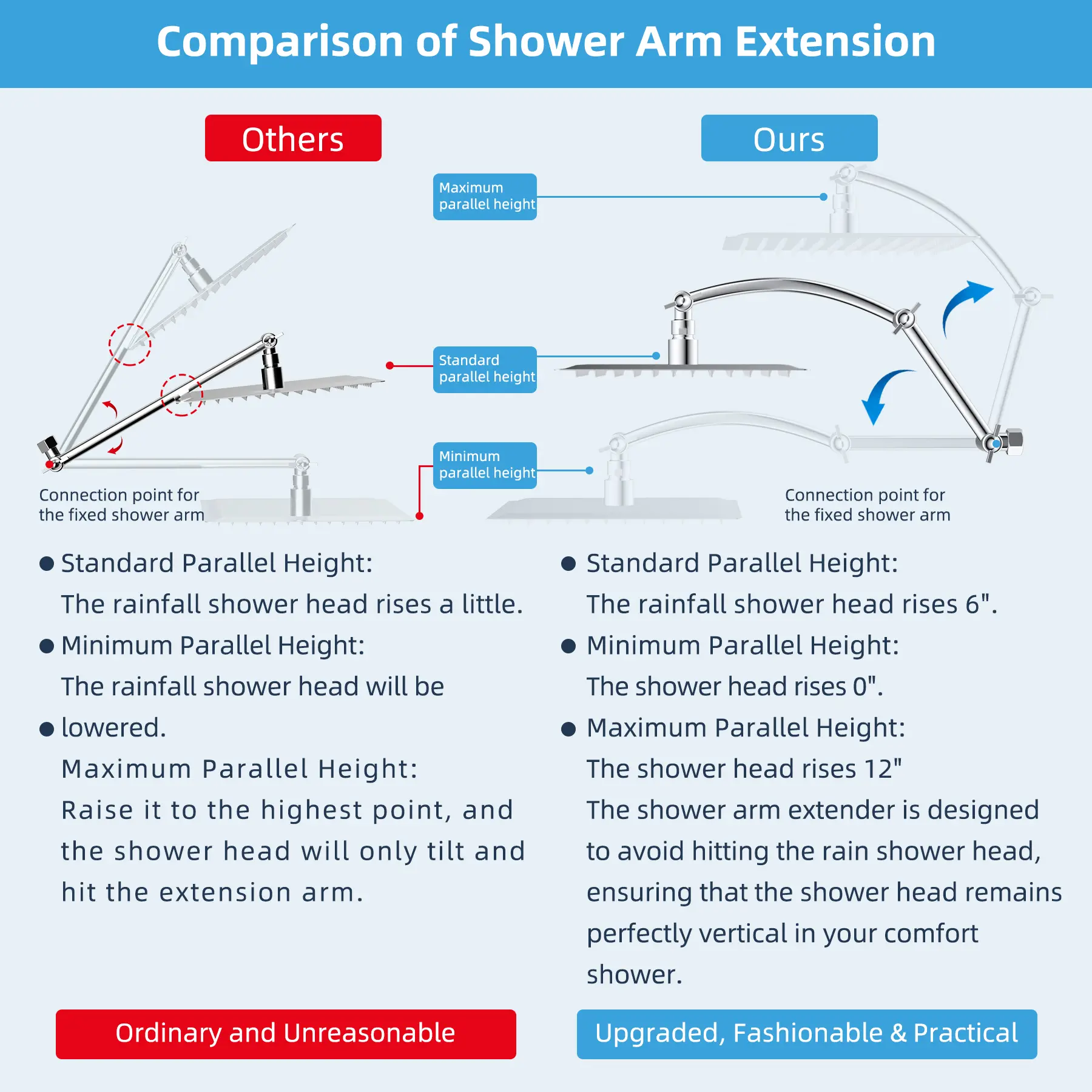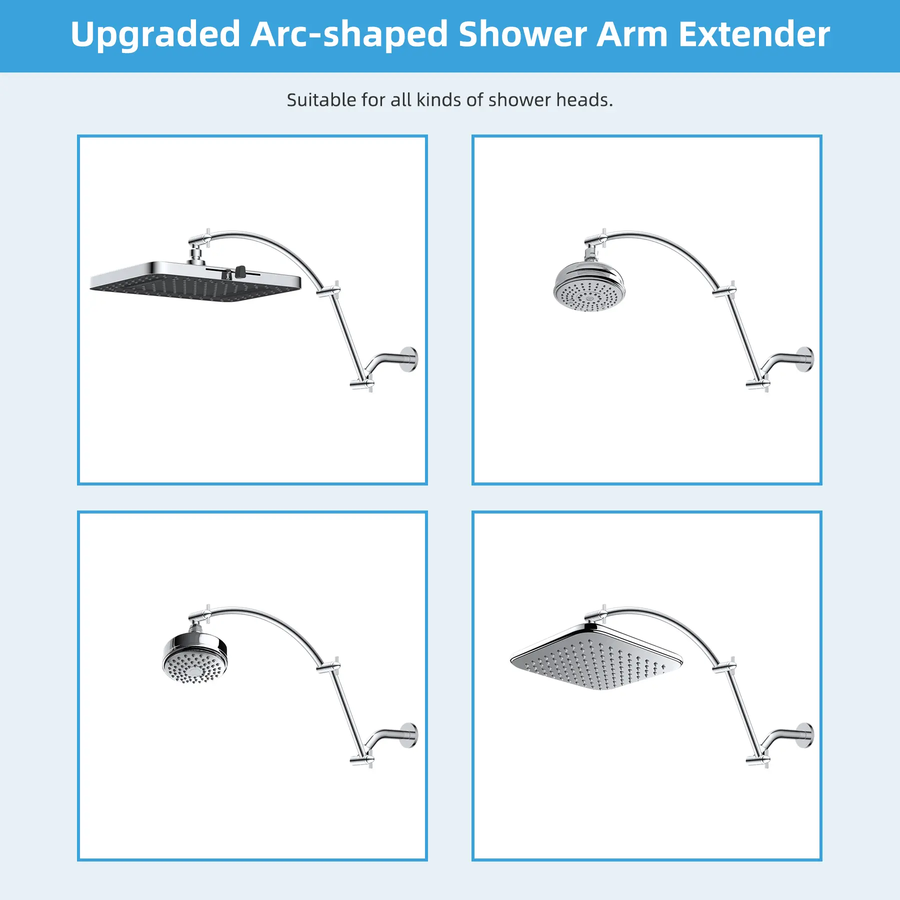 ·Upgraded 20'' Shower Extension Arm: Height & angle adjustable arc-shaped design enhances its bearing capacity, high rise your shower head to achieve vertical water. Compared with the regular shower arm extender, the Hibbent shower arm extension can raise the shower head higher or lower and keep the shower head in a horizontal position all the way. The shower head is always vertical in your large size and will not hit the shower arm, instead of sloping water like an ordinary straight shower arm