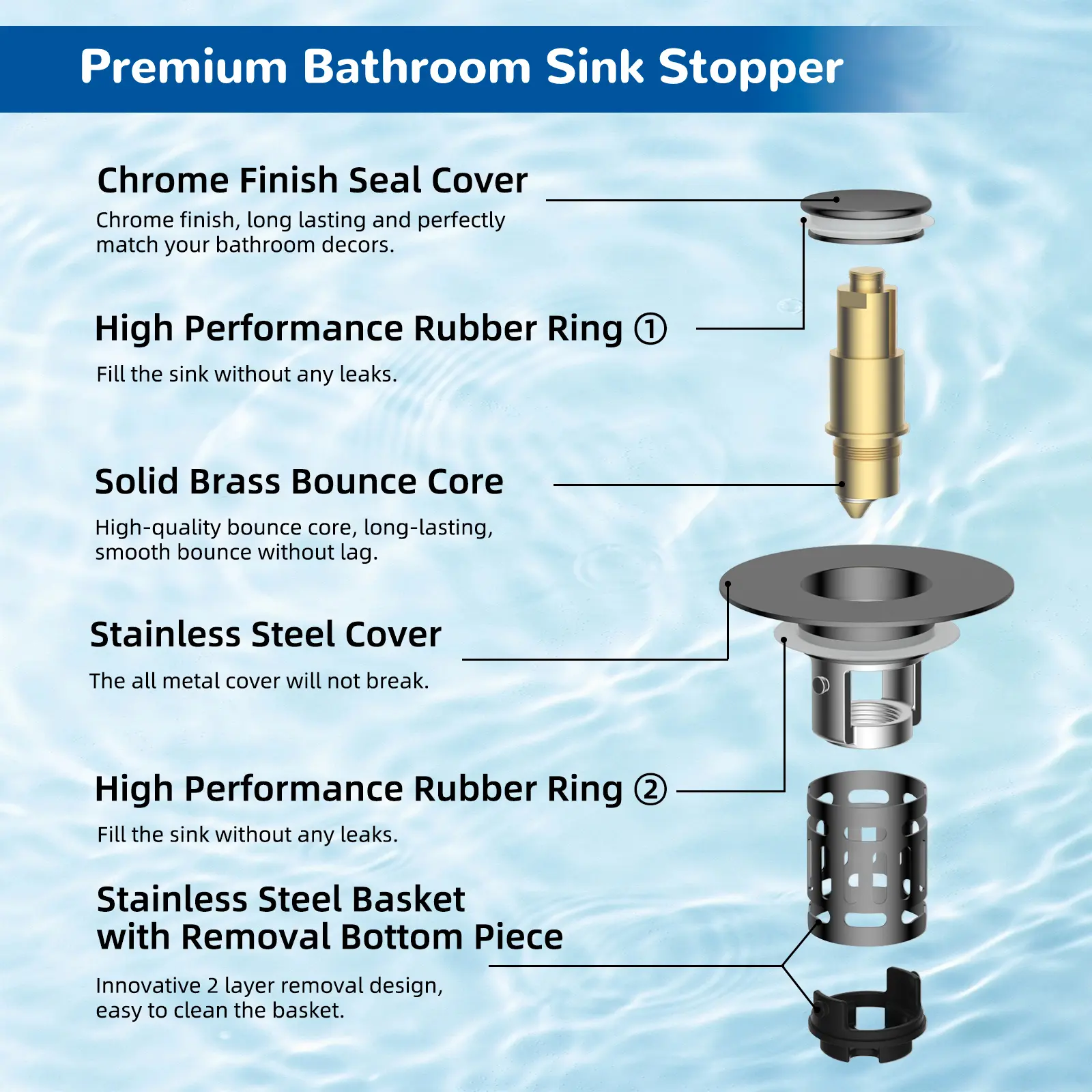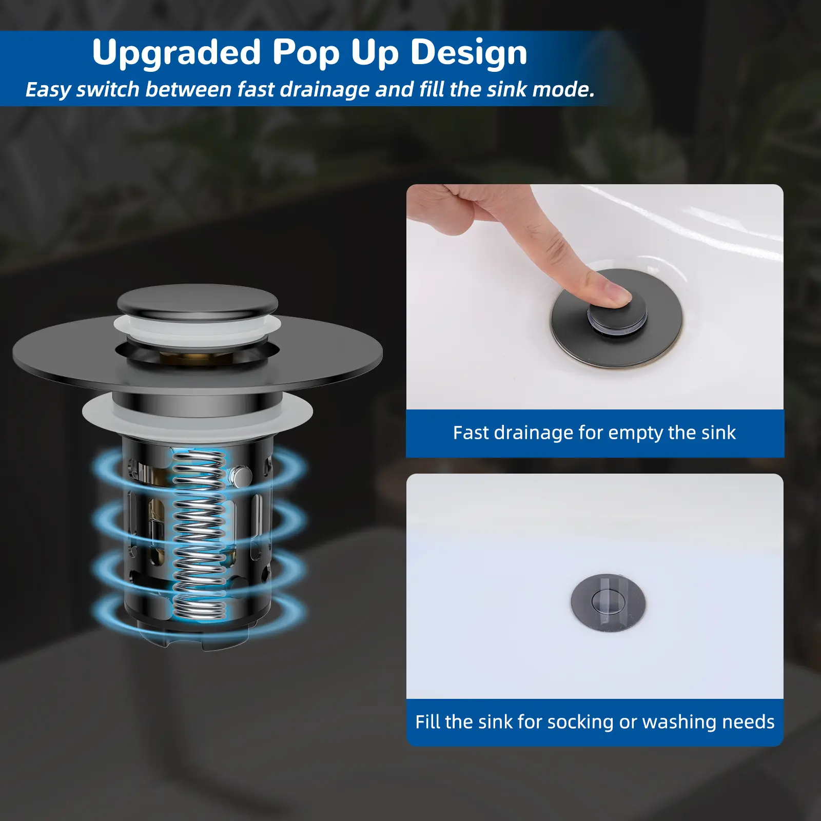 ·[Pop-up Design] Our pop-up sink drain strainer is made of high-quality stainless steel, plastic, and solid brass, providing exceptional rebound strength, corrosion resistance, and long-lasting durability. It features a long-lasting and sensitive pop-up brass bullet core mechanism, allowing you to easily switch between the water storage and fast drainage modes with just a gentle press