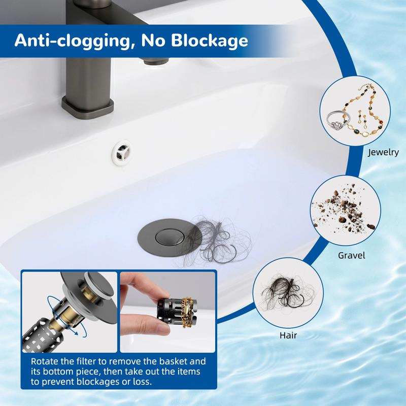 ·[Upgraded 3 in 1 Design] The Hibbent bathroom sink drain strainer boasts an innovative 3-in-1 design that seamlessly integrates water storage, rapid drainage, and effective filtering functions. In water storage mode, it caters to your soaking or washing needs, while the drainage mode efficiently empties the sink. The built-in basket captures small items like hair, jewelry, and debris, preventing them from clogging the drain and allowing you to recover valuable items like earrings and necklaces. This multifunctionality greatly enhances your daily convenience. Note: This stopper is NOT suitable for bathtub drains!