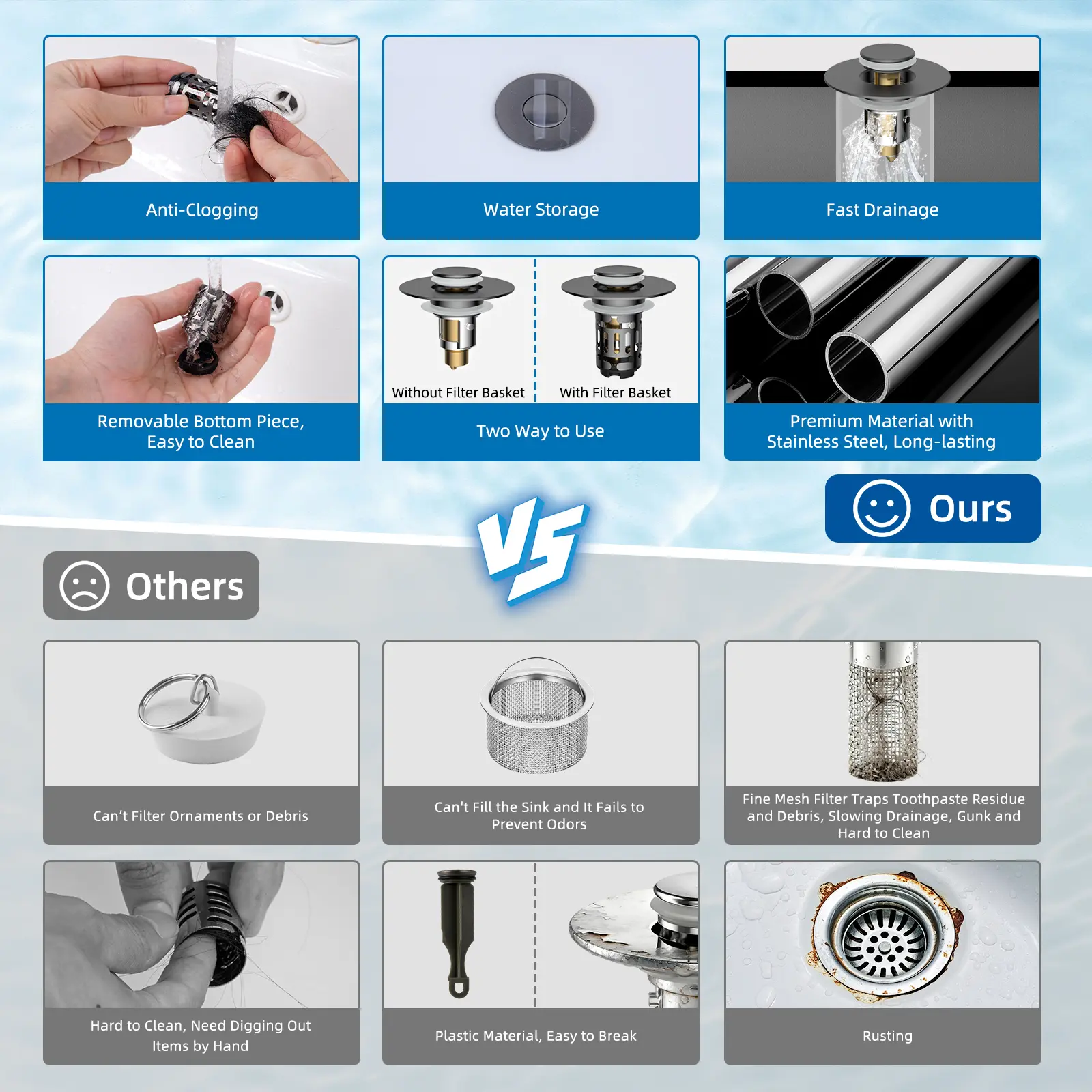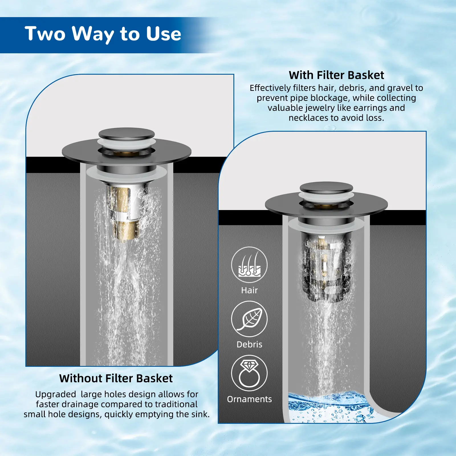 ·[Innovative Two-Layer Removable Basket] Our sink stopper features a dual-layer removable stainless steel basket designed for two usage modes. With the basket in place, it effectively filters small items to prevent blockages. When removed, the sink strainer enables swift drainage through two larger holes, promoting faster water flow and streamlining your daily tasks. Plus, the two-piece removable basket is easier to clean and maintain, ensuring better hygiene than traditional fixed-bottom baskets