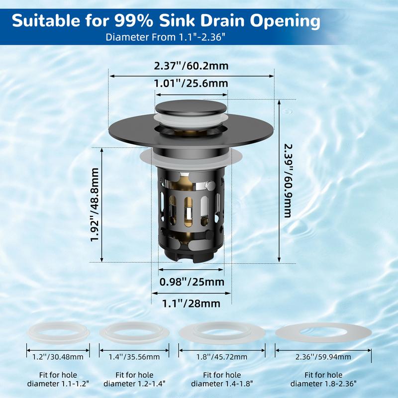 ·[Versatile Compatibility & Easy Installation] This bathroom sink drain stopper includes four O-rings, which are designed to fit 99% of standard US sink drains, including bathroom sinks and washbasins with drain holes measuring between 1.1" and 2.36". The installation is quick and hassle-free, without the need for expensive tools or plumber fees. Simply remove your old stopper and insert the new one into the drain hole, installation only takes a few seconds. Note: To ensure compatibility, please remember to measure your bathroom sink drain opening diameter before purchasing to confirm a proper fit