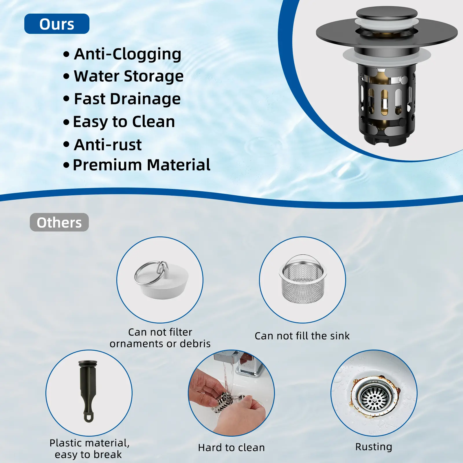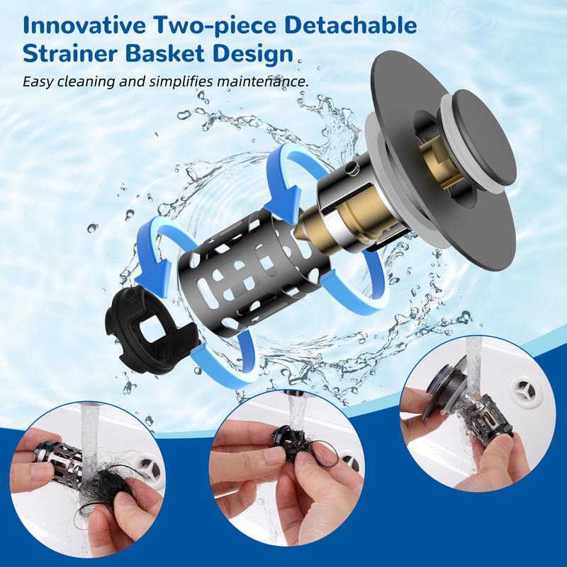 ·[Easy to Clean] Cleaning is just as easy. The dual-layer removable basket can be easily removed by simply twisting, allowing you to thoroughly clean all components of the drain stopper. Additionally, the basket's detachable bottom design surpasses similar non-removable options, making cleaning more comprehensive and preventing the awkwardness and inconvenience of digging out items by hand