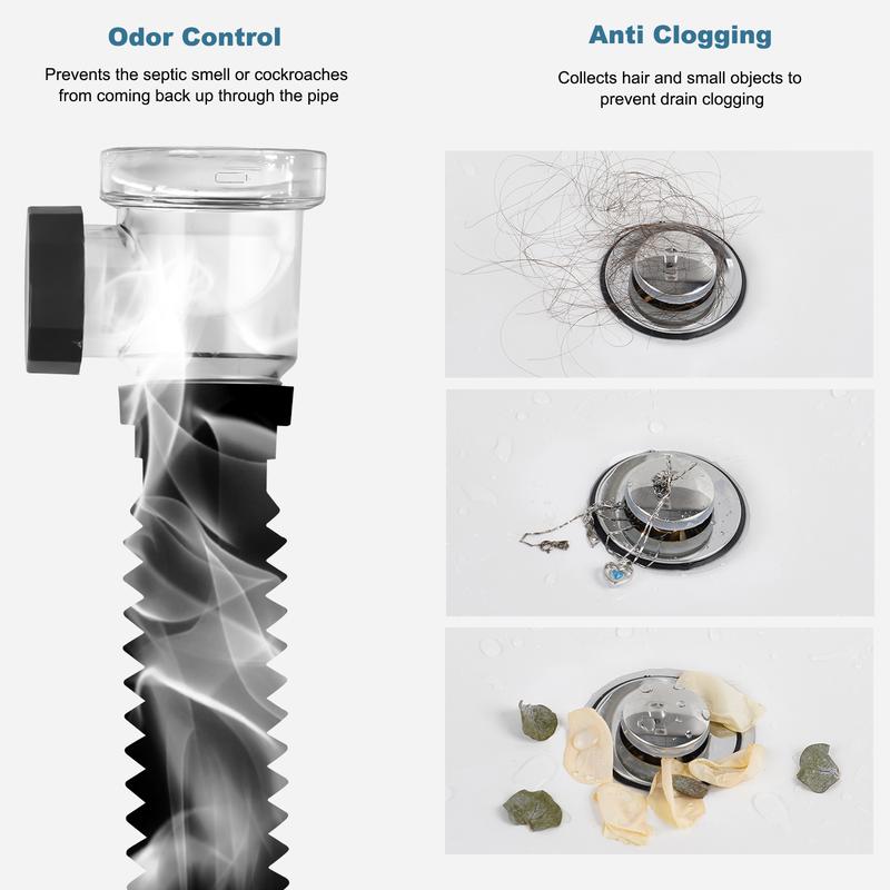 3-in-1 Bathroom Sink Drain Strainer Kit: Comes with drain stopper, P-trap Tubing and odor catcher. Anti-clogging and anti-odor. The p-trap bathroom sink with drain strainer features an anti-clogging basket filter, conveniently collecting hair and fines to prevent clogs. The inner part includes an anti-odor core for effective odor blocking and deodorization