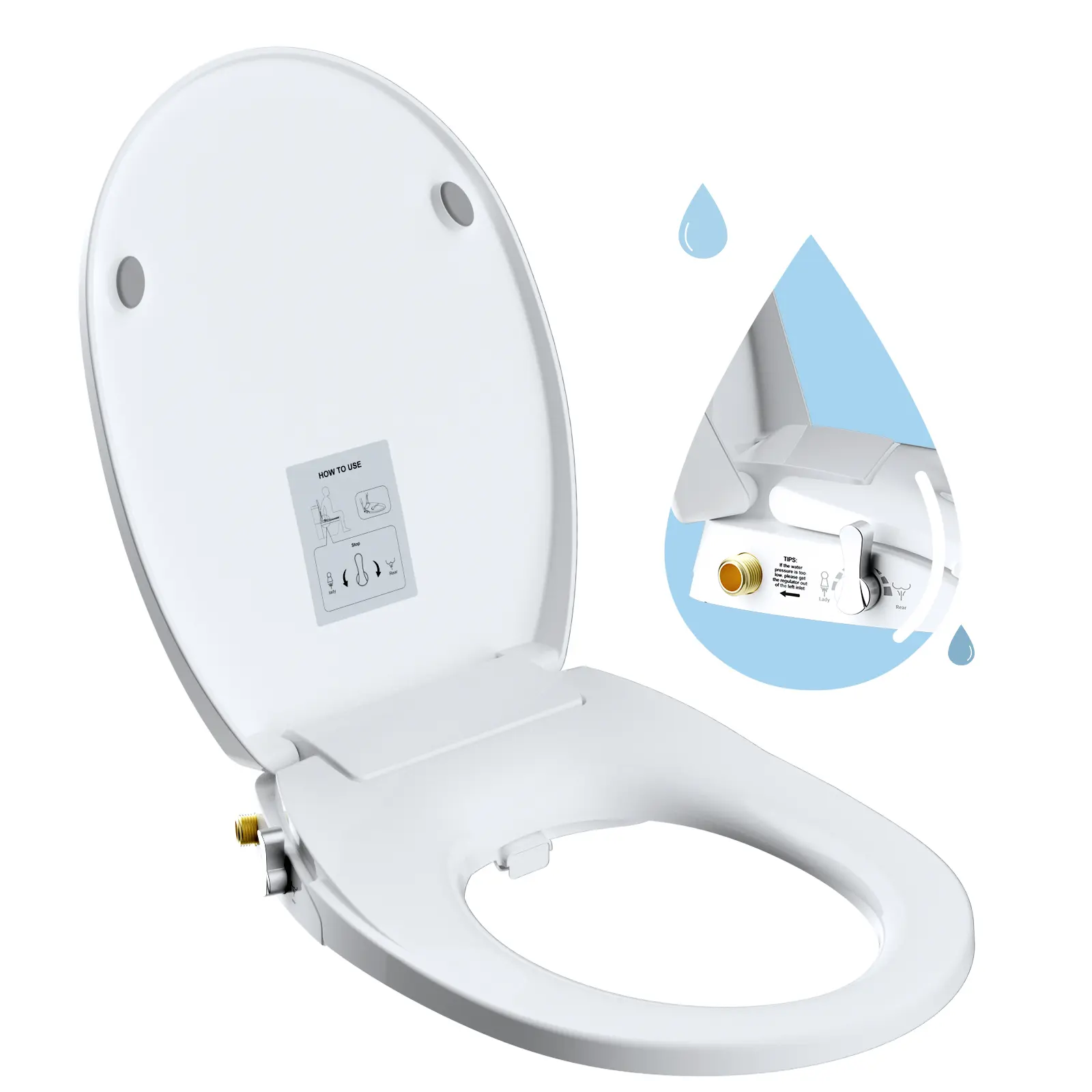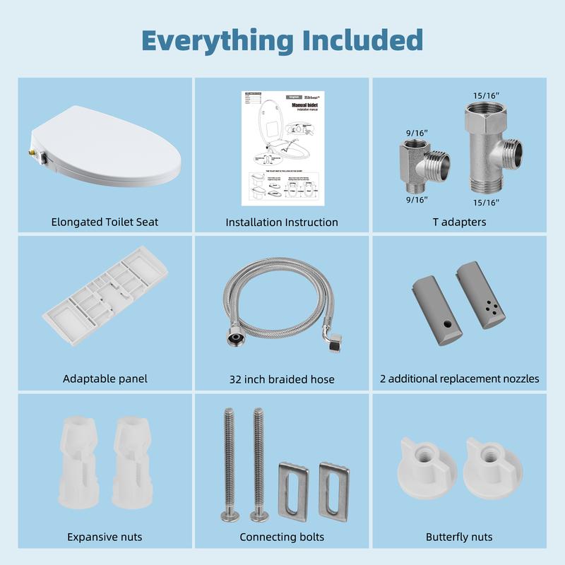 ·【No Electricity or Plumbing】Simple installation with no specialized tools required. Hibbent bidet toilet seat contains toilet seat x 1, 32 inch stainless steel braided hose x 1, 9/16'' (3/8'') mental T-adapter x 1, 15/16'' (7/8'') mental T-adapter x 1, rubber washers, additional replacement nozzle x 2, and instruction x 1. The upgraded Bidet toilet seat can be installed in less than half an hour, just like a regular toilet seat.