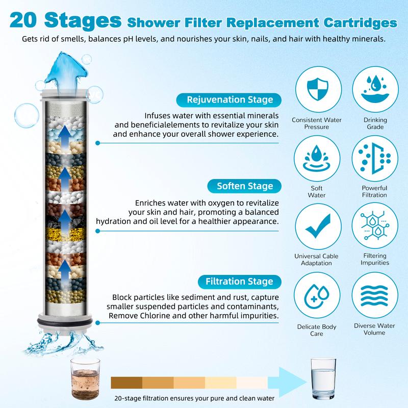 [Advanced 20-Stage Filtration System] Our innovative filter showerhead features a 20-stage filtration system that ensures high water quality. The Filtration Stage removes sediment, rust, chlorine, and other impurities, while the Soften Stage enriches the water with oxygen to revitalize skin and hair while promoting balanced hydration. The Rejuvenation Stage infuses the water with essential minerals for a refreshing and rejuvenating shower. The filter handheld effectivelybalances pH levels, nourishes your skin, nails, and hair with healthy minerals. After each shower, you will have softer, shinier hair and smoother skin. Farewell to dry, tangled hair and irritated skin