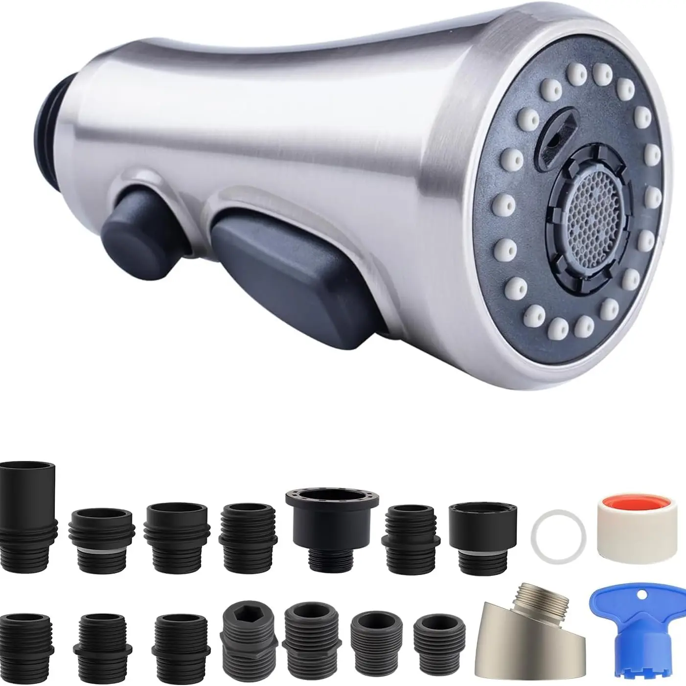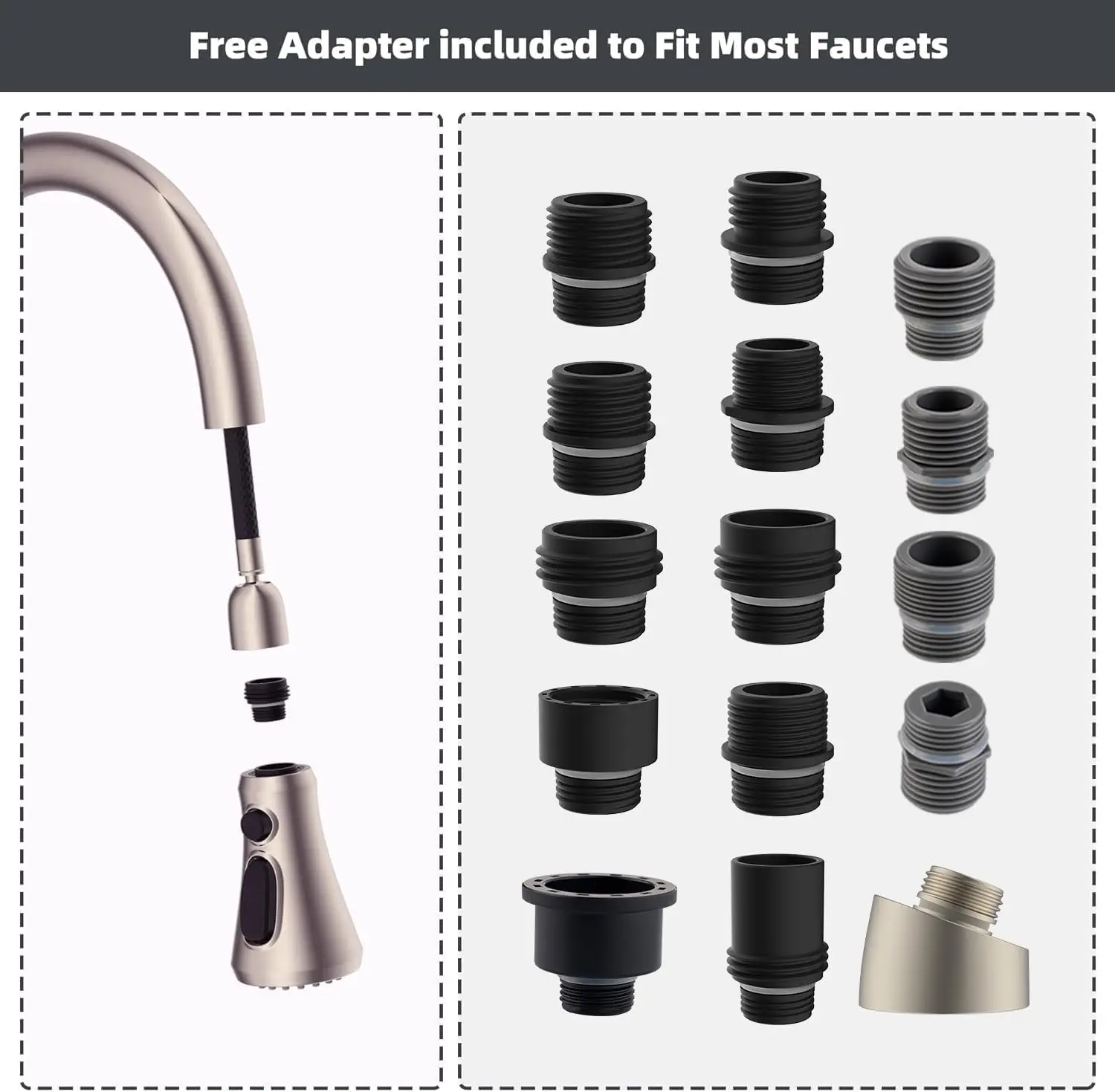 15 adapters for various pull down faucet types.