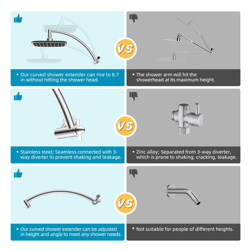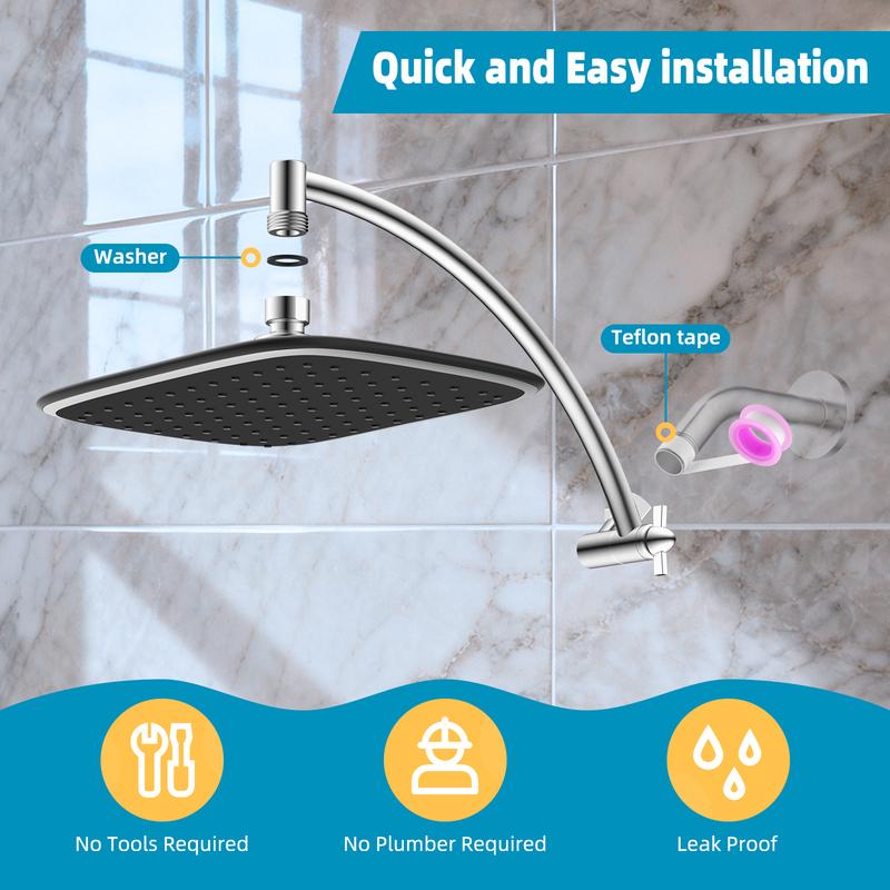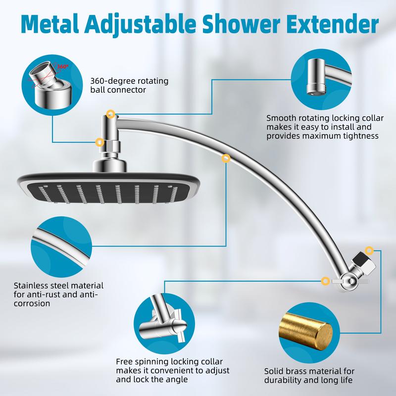 Adjustable Shower Arm Extension: The 12-inch curved shower arm extender is made of solid brass and stainless steel and easily fits any rainfall shower heads or fixed showerheads. The curved design not only enhances the arm's strength and height but also ensures the shower head remains steady and vertical, preventing water splashing. This innovative design ensures the shower head remains vertical and at a great height, preventing it from hitting the shower arm extender