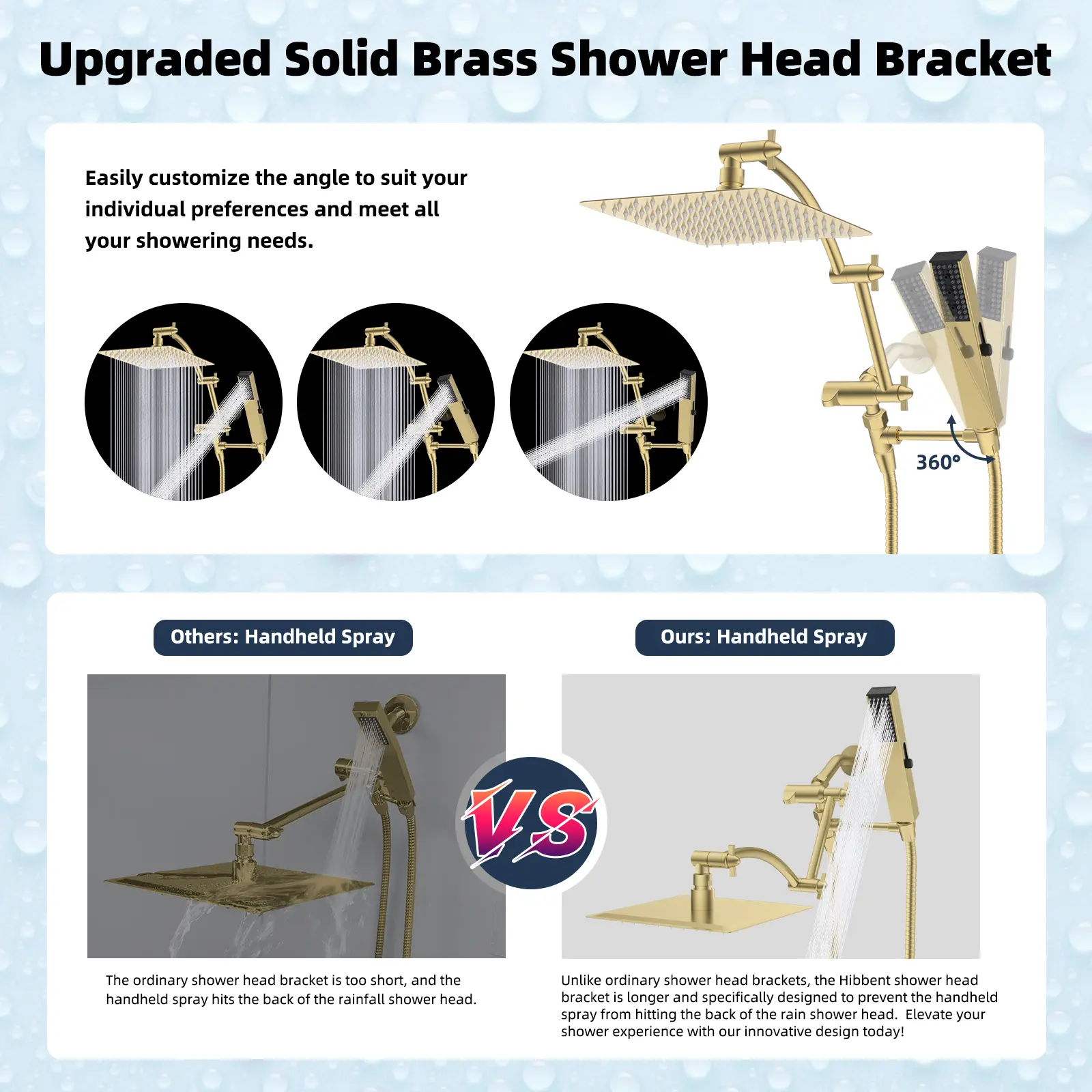 5. Hibbent All Metal 10'' Rainfall Shower Head, Shower Head Combo, High Pressure Handheld Shower Wand, 4 Sprays, 16'' Adjustable Arc-shaped Extension Arm, 71'' Hose, Showerhead Holder, Brushed Gold