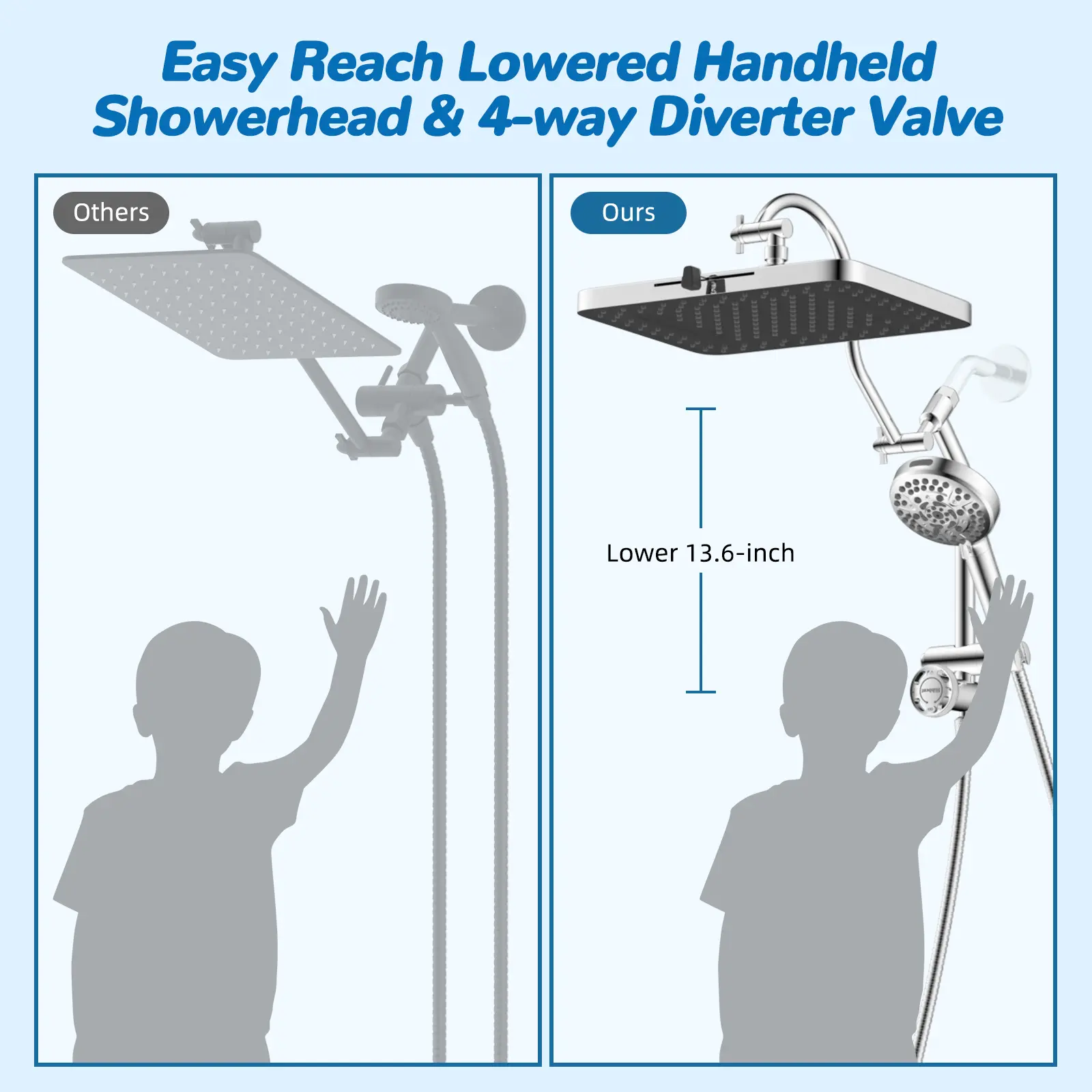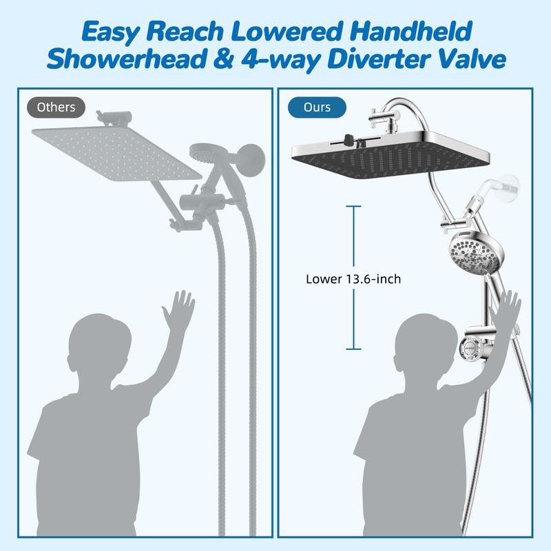 [Easy Reach 4 Way Diverter Shower Extension Arm] The innovative 4-way diverter shower arm is crafted from long-lasting all-metal material, ensuring strength while preventing leaks and wobbling with its integrated design. It offers a versatile combination of four spray modes: Handheld Spray, Rainfall Spray, Rainfall + Handheld Spray, and Pause Mode, catering to all your showering needs. The lowered 4 way diverter design is suitable for both adults and children, while the adjustable handheld holder allows for various angles and is longer than standard brackets, minimizing splashes and enhancing your overall shower experience
