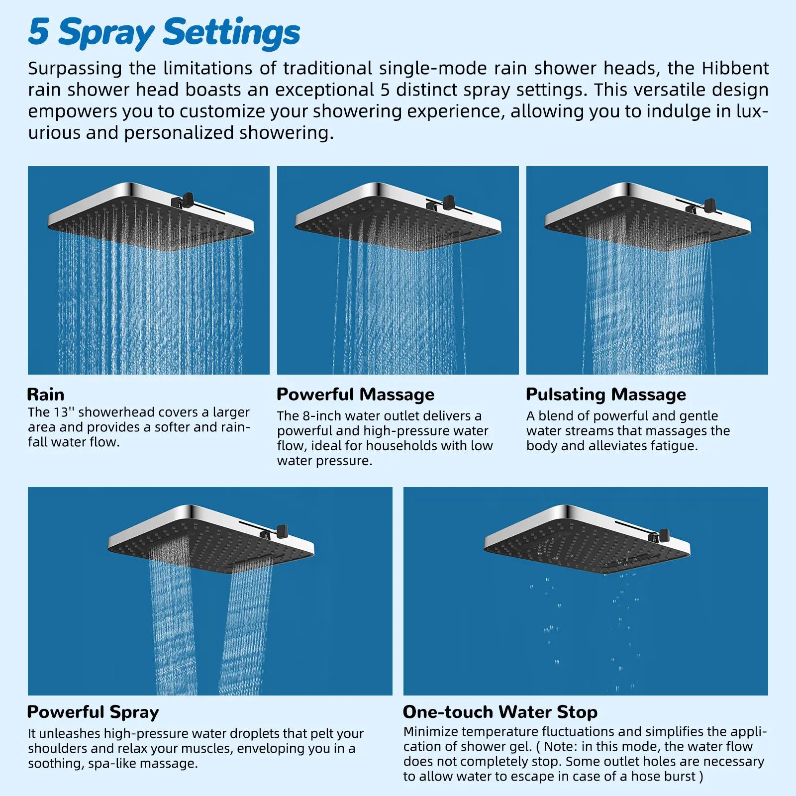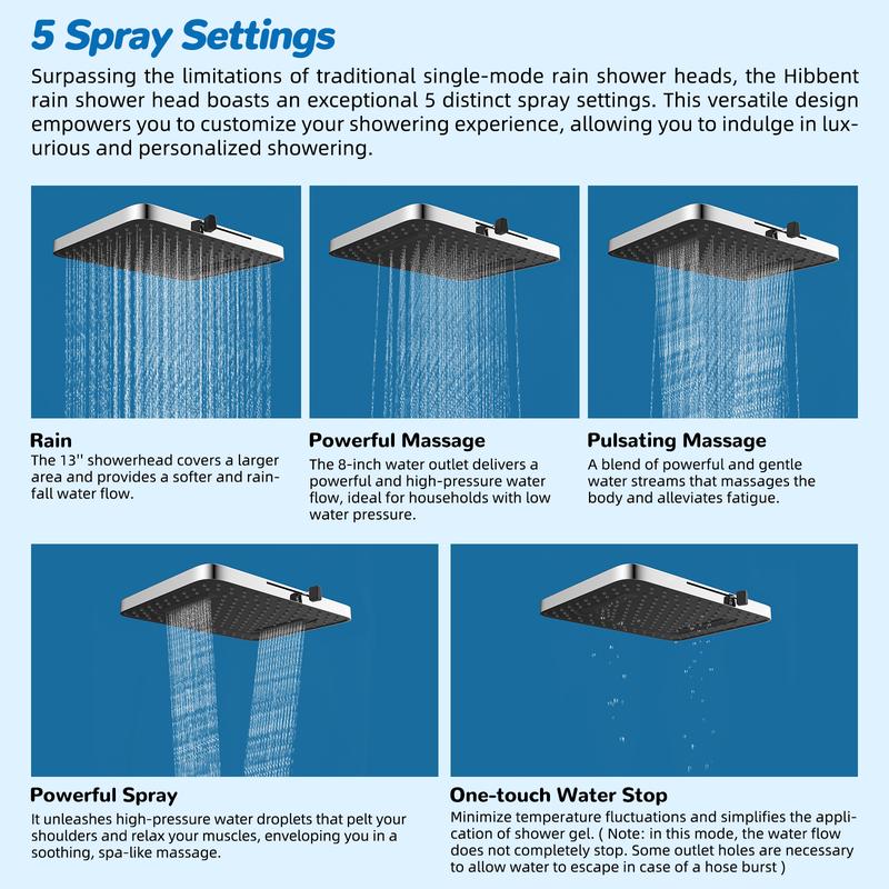 [Upgraded 5 Spray 13" Rainfall Shower Head] This 13”rain showerhead features 157 splash jets to offer greater coverage than traditional models. It delivers a dynamic, high-pressure massage experience, ensuring a lavish shower even in low-water pressure areas. Enjoy a soothing rain mode in gentle water flow, or switch to the 8-inch powerful massage mode for a revitalizing experience that eases sore muscles. The pulsating massage setting effectively reduces fatigue, while the shoulder massage feature targets tension with a focused spray for ultimate relaxation. Plus, the intuitive one-touch water stop minimizes temperature fluctuations, making it easy to apply shower gel or rinse off