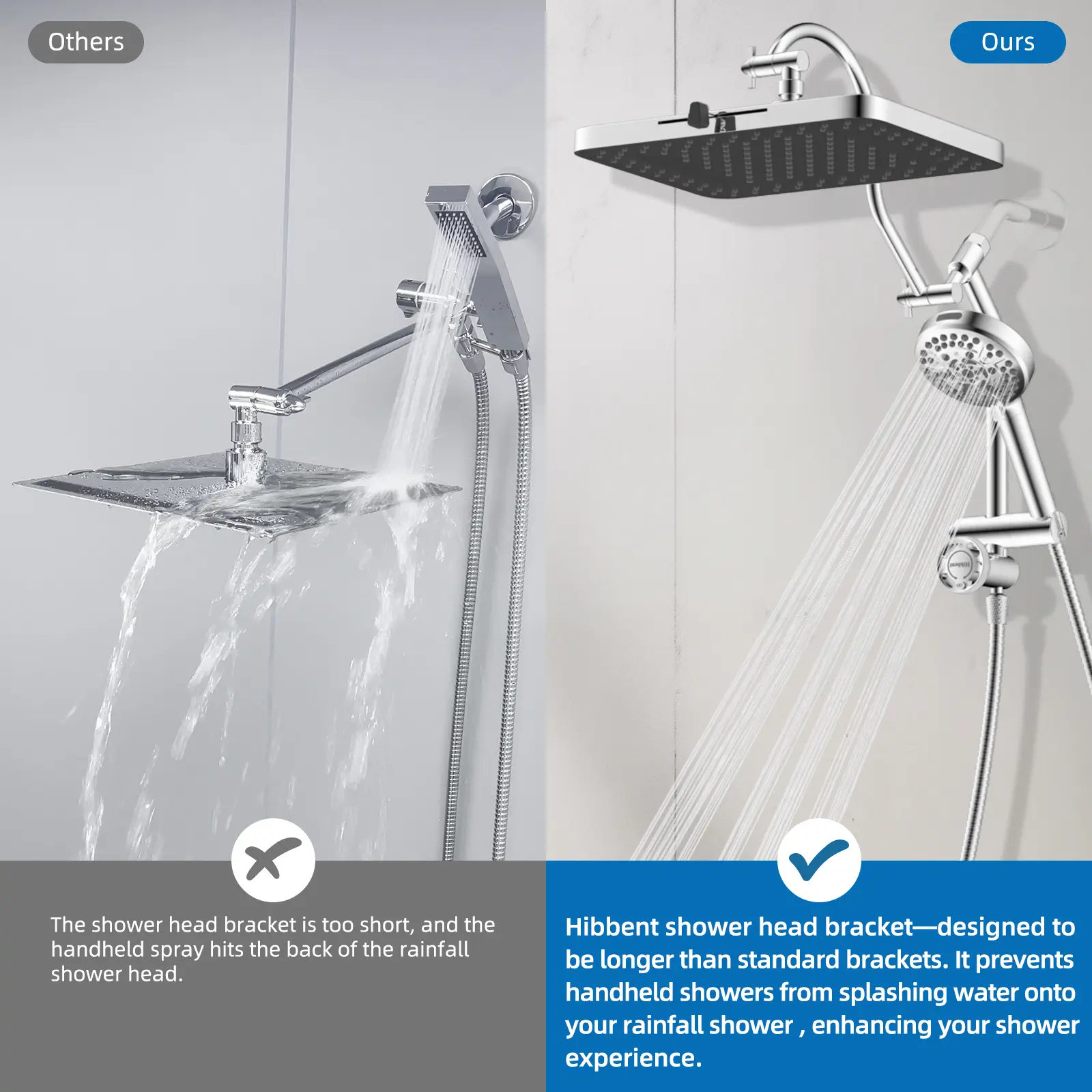 [Upgraded Integrated Curvered Shape Extension Arm] The integrated shower extension arm ensures a tight seal, preventing any water leaks and guaranteeing safe water usage. Unlike standard shower arm extenders, the Hibbent shower arm equiped with upgraded curved shape shower arm which allows you to raise or lower the shower head while keeping it in a horizontal position, preventing any collisions with the arm. The height-adjustable handheld shower head holder can be easily adjusted to accommodate different heights, which is designed for convenient use by everyone, including the elderly, children, adults, and wheelchair users