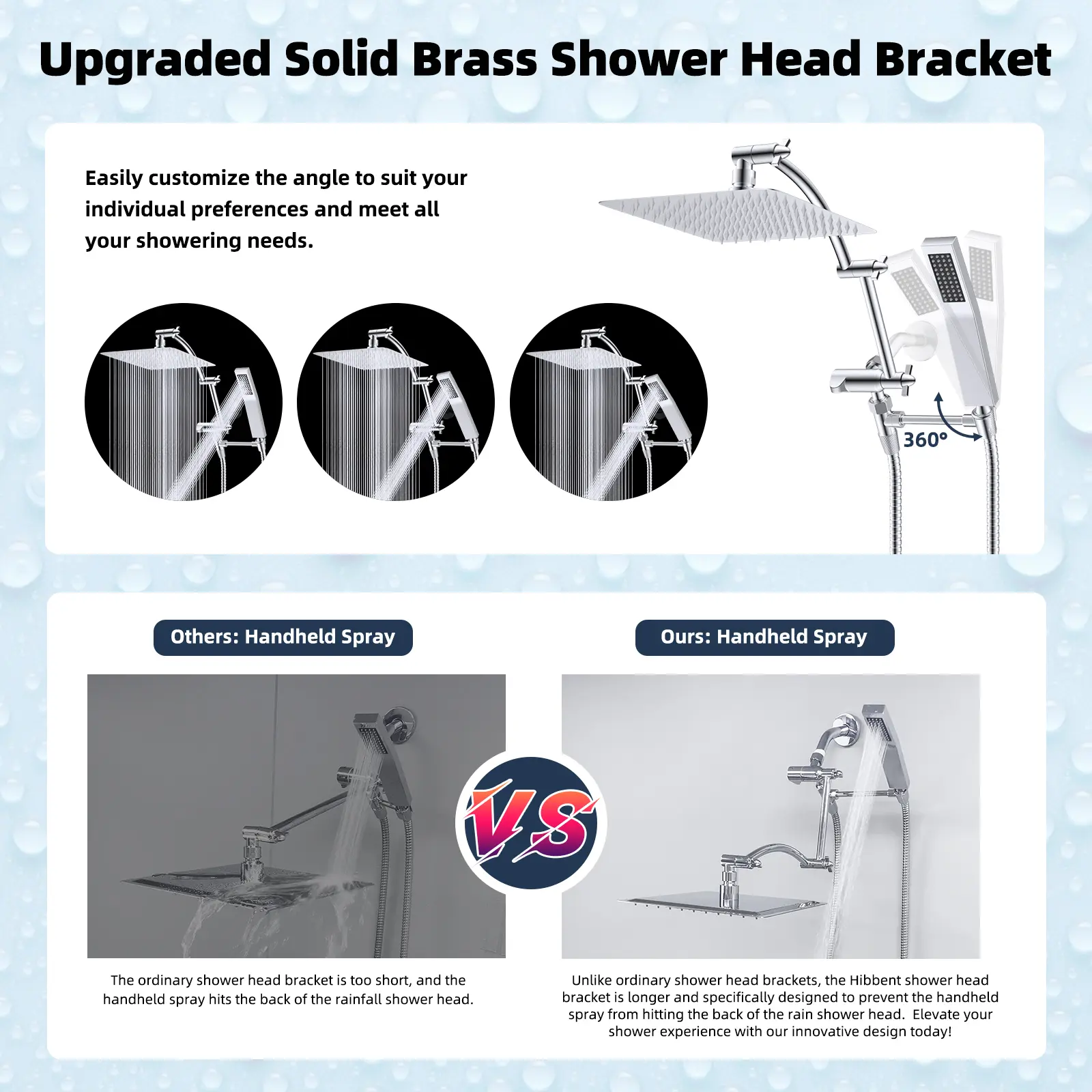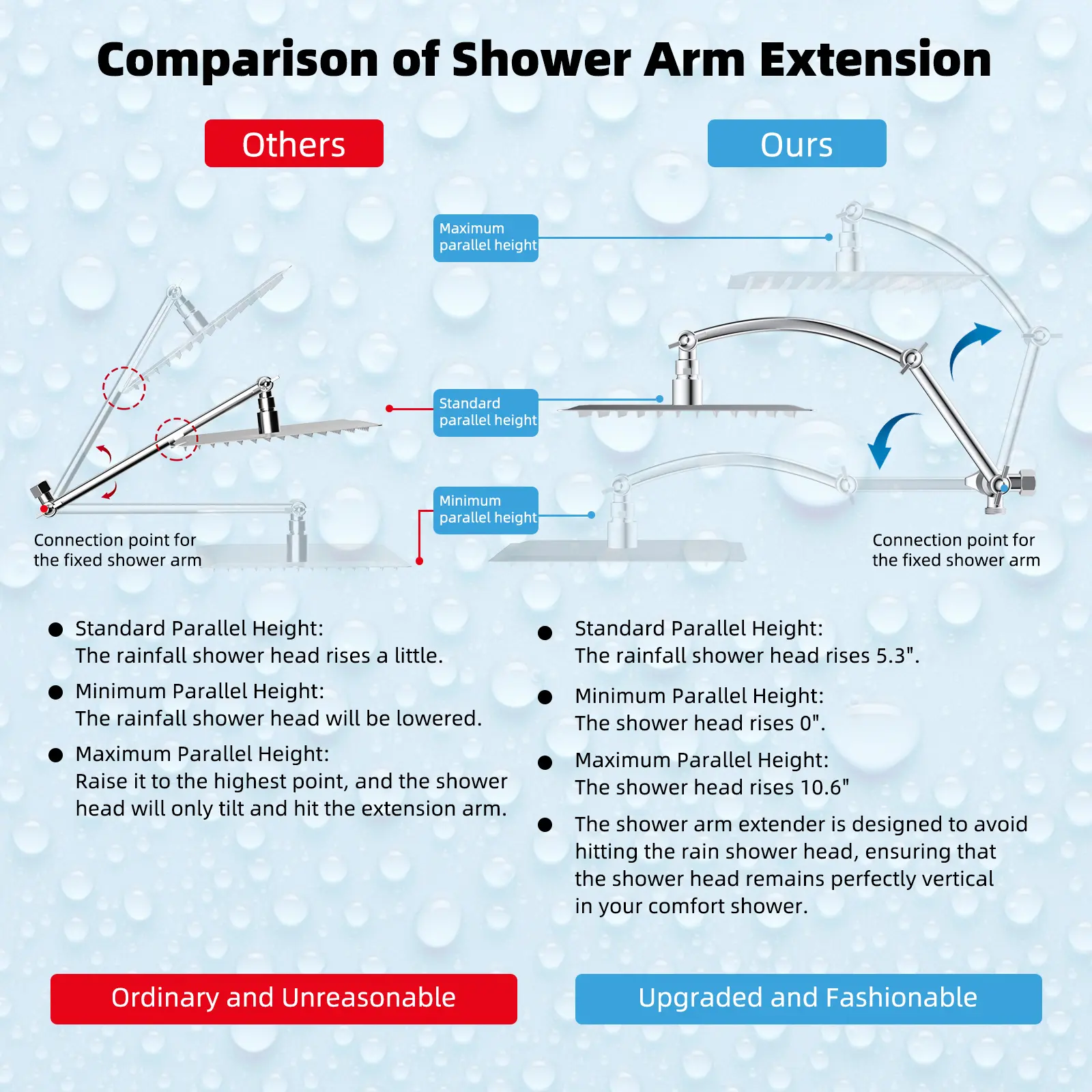 The adjustable arc-shaped design enhances bearing capacity, raising the shower head vertically. It allows for height and angle adjustments, keeping the shower head horizontal. This ensures the shower head doesn't hit the arm, unlike a straight shower arm that may slope water.