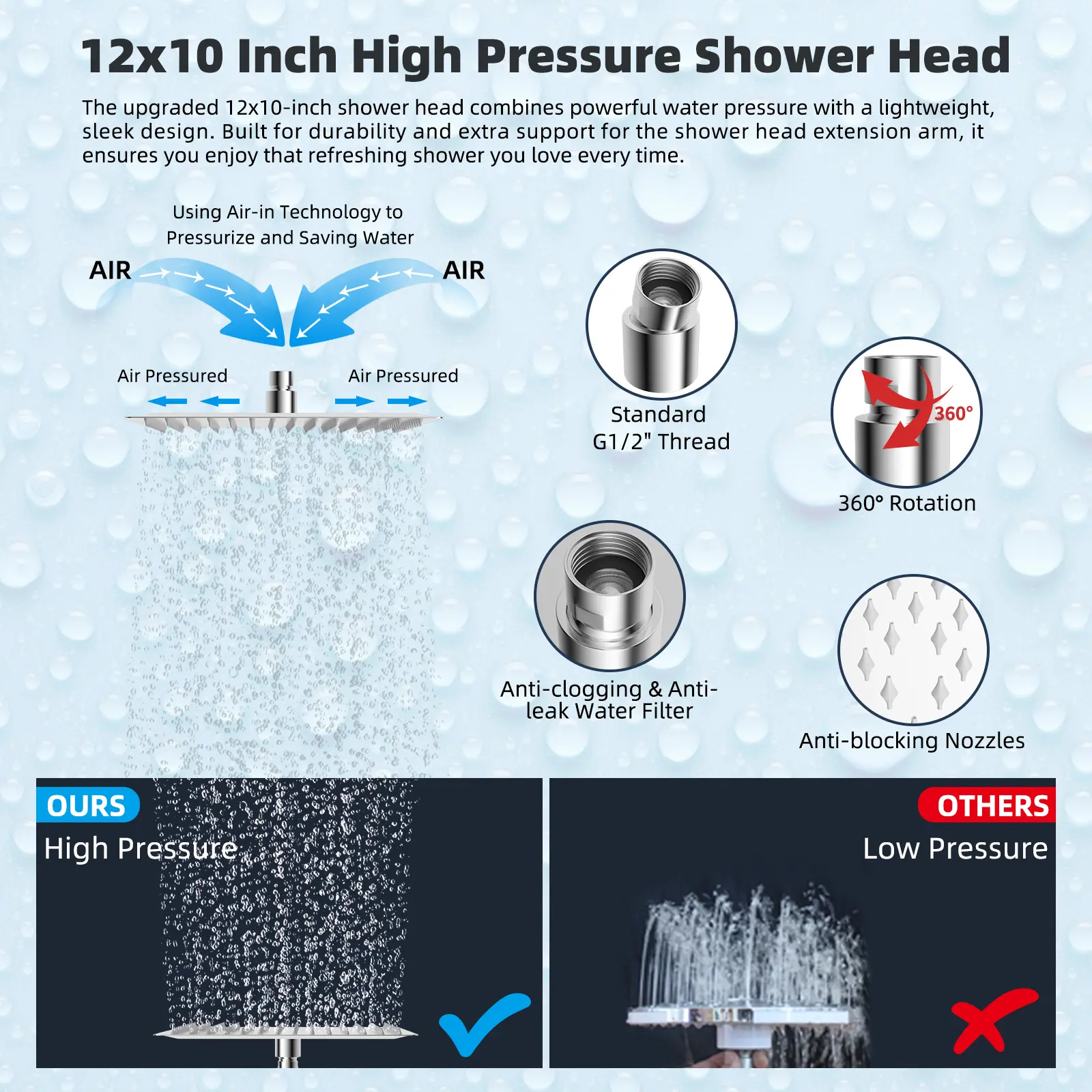 The 12x10'' Rainfall Shower Head is crafted from certified SUS 304 stainless steel, ensuring rust resistance and longevity. Its ultra-thin design, paired with air-in technology, creates a luxurious rain spray with 154 splash jets. This upgraded shower head offers increased water pressure and is lightweight,