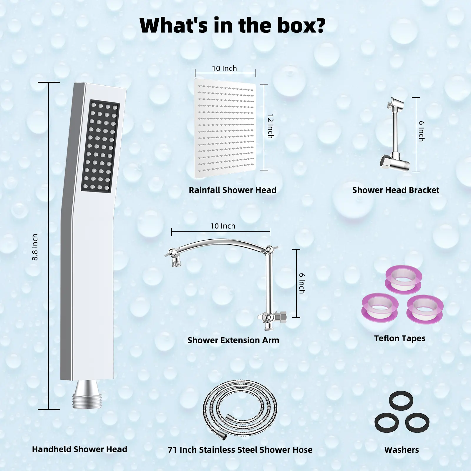 The Hibbent combo includes a 12x10 inch rain shower head, handheld shower head, 71-inch stainless steel hose, 16-inch extension arm, bracket, washers, Teflon tape, and installation manual. The 71-inch hose is made of odorless EPDM material, suitable for high-pressure and temperature environments.