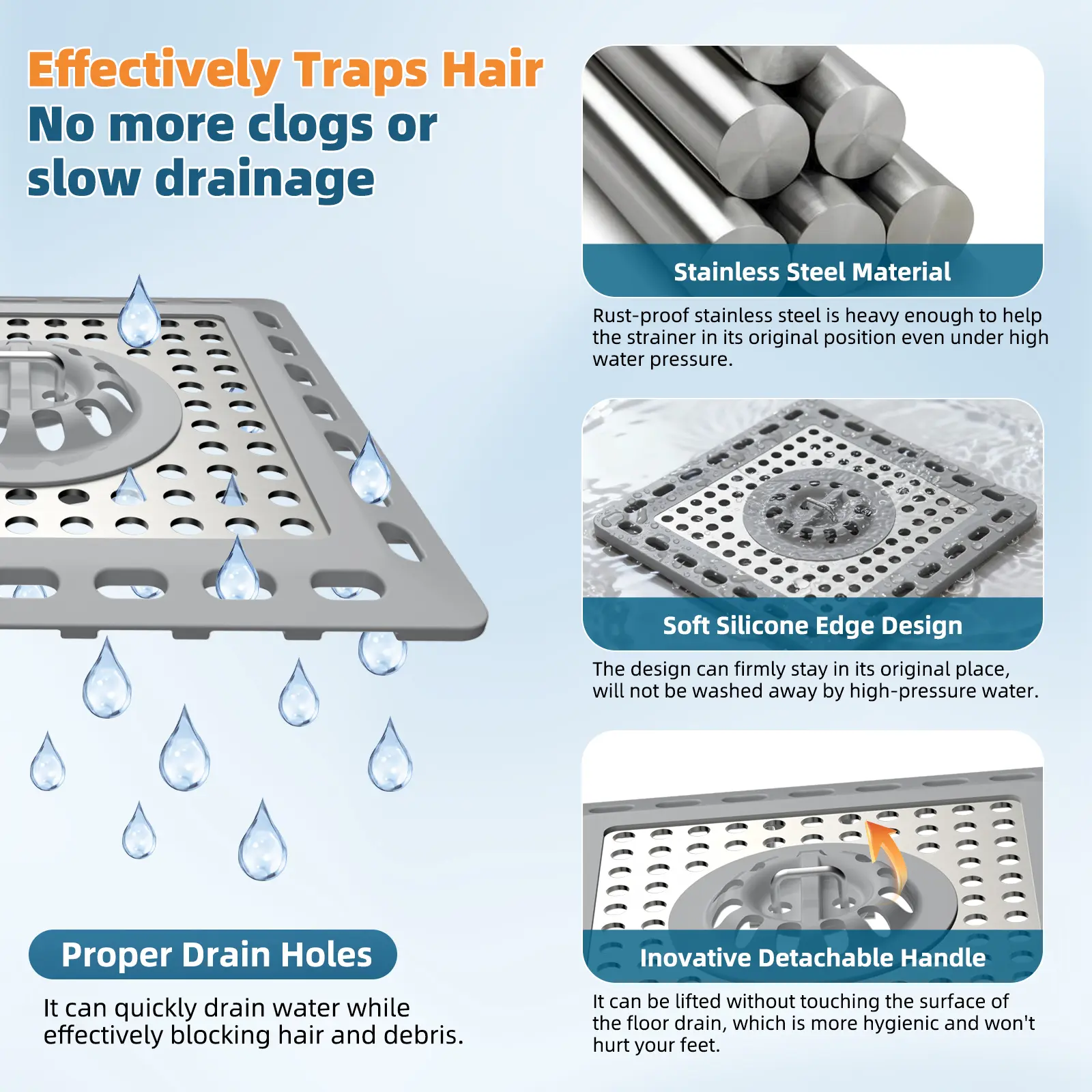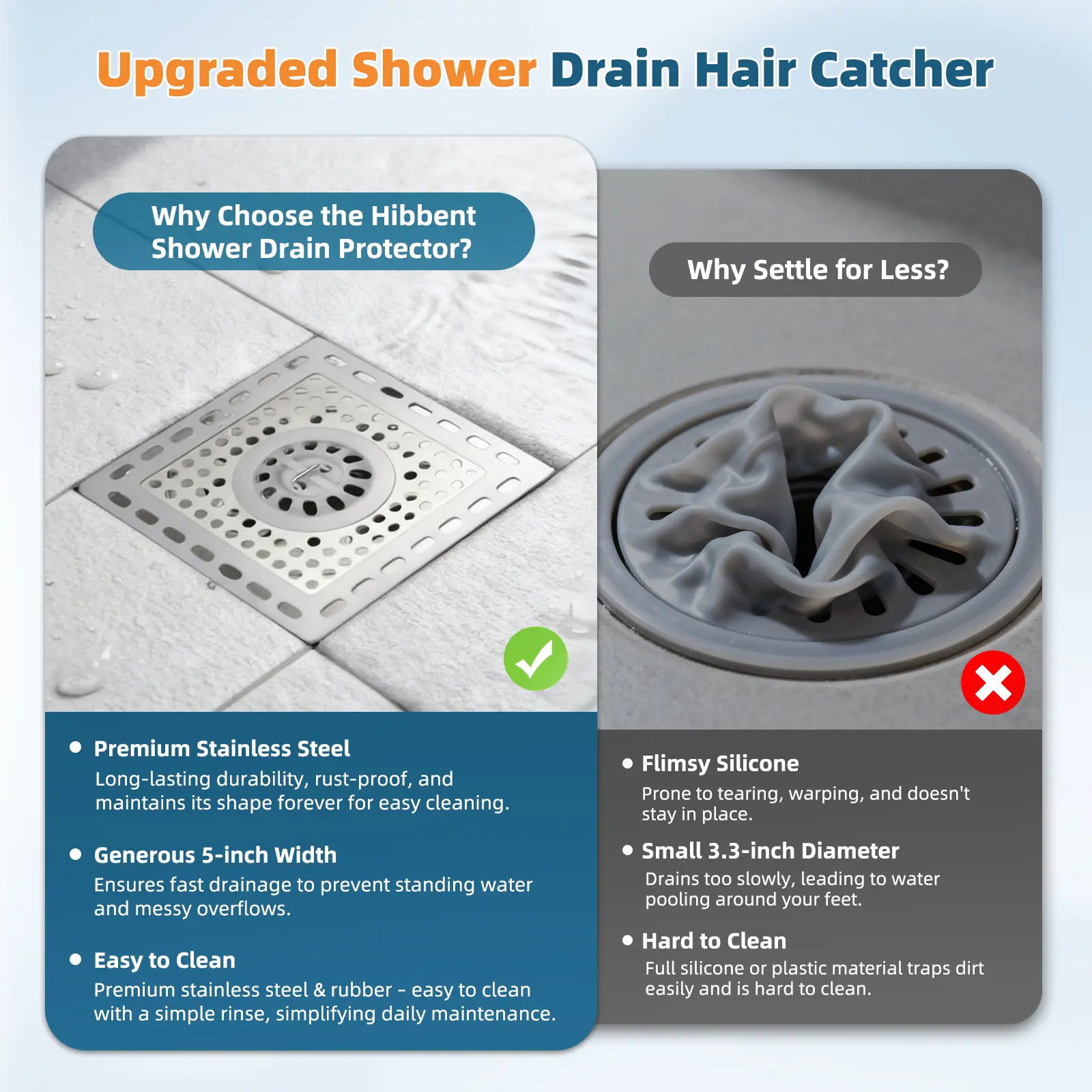 [Premium Stainless Steel & Thickened Silicone Construction] The Hibbent shower drain hair catcher is made of rust-proof stainless steel and soft silicone. It can securely remain in its original position even under high water pressure. The metal hair catcher can effectively trap hair, soap scum, and small debris before they sneak into your sewer pipes. The thickened silicone edge ensures no slip, no shifting and no deformation, providing users with a stable and pleasant showering experience