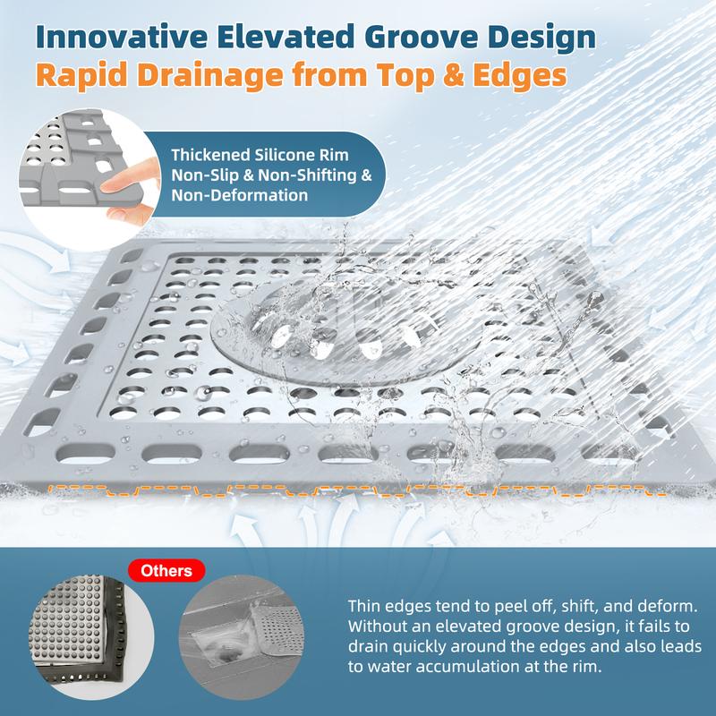 [Innovative Elevated Groove Design] The Hibbent Hair Catcher Shower Drain Cover features a unique elevated groove design around its edges. Unlike other products with thinner, shorter silicone edges, our bathtub hair catcher enables faster drainage from both the top and around the edges simultaneously—draining more quickly and thoroughly. It avoids the edge water accumulation and incomplete drainage that plague ordinary models