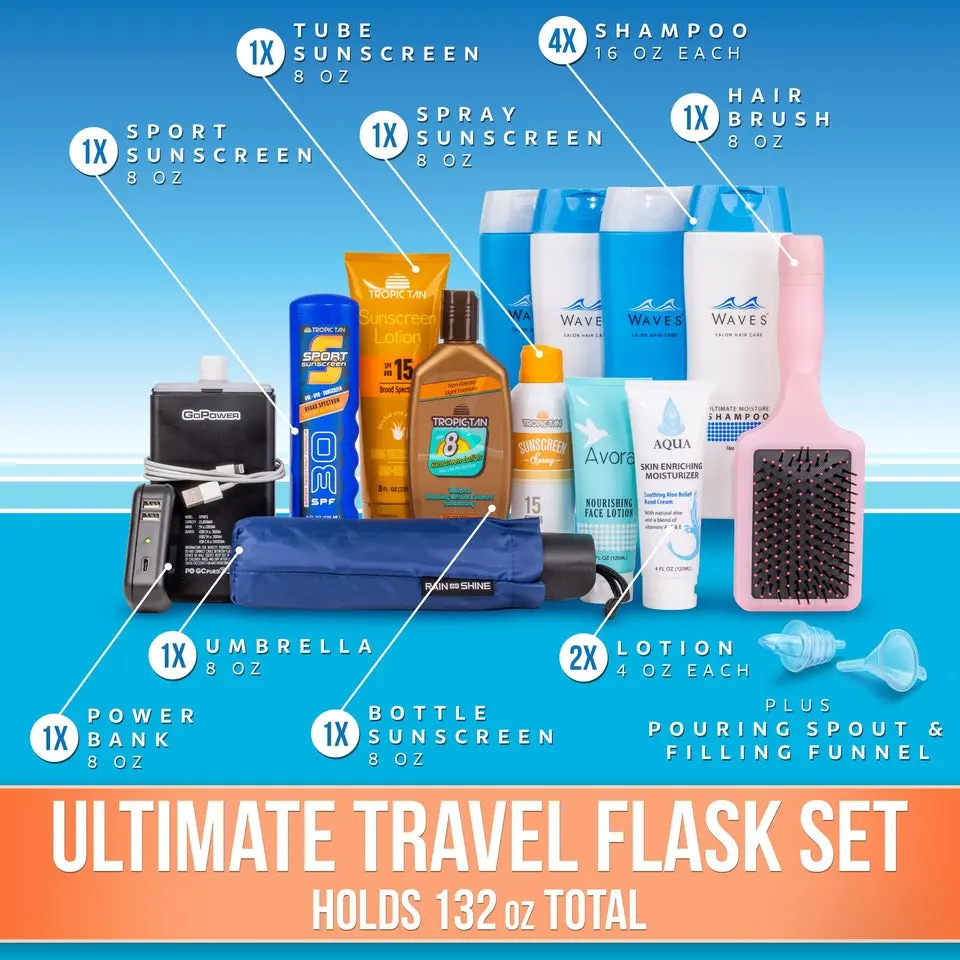 ·BUNDLE PACK DEAL: 45 percent savings compared to buying our flasks separately; Set includes 2 Shampoo, 2 Conditioner, 2 Lotion, 1 Classic Sunscreen, 1 Sport Sunscreen, 1 Tube Sunscreen, 1 Spray Sunscreen, 1 Power Bank, 1 Umbrella, & 1 Brush