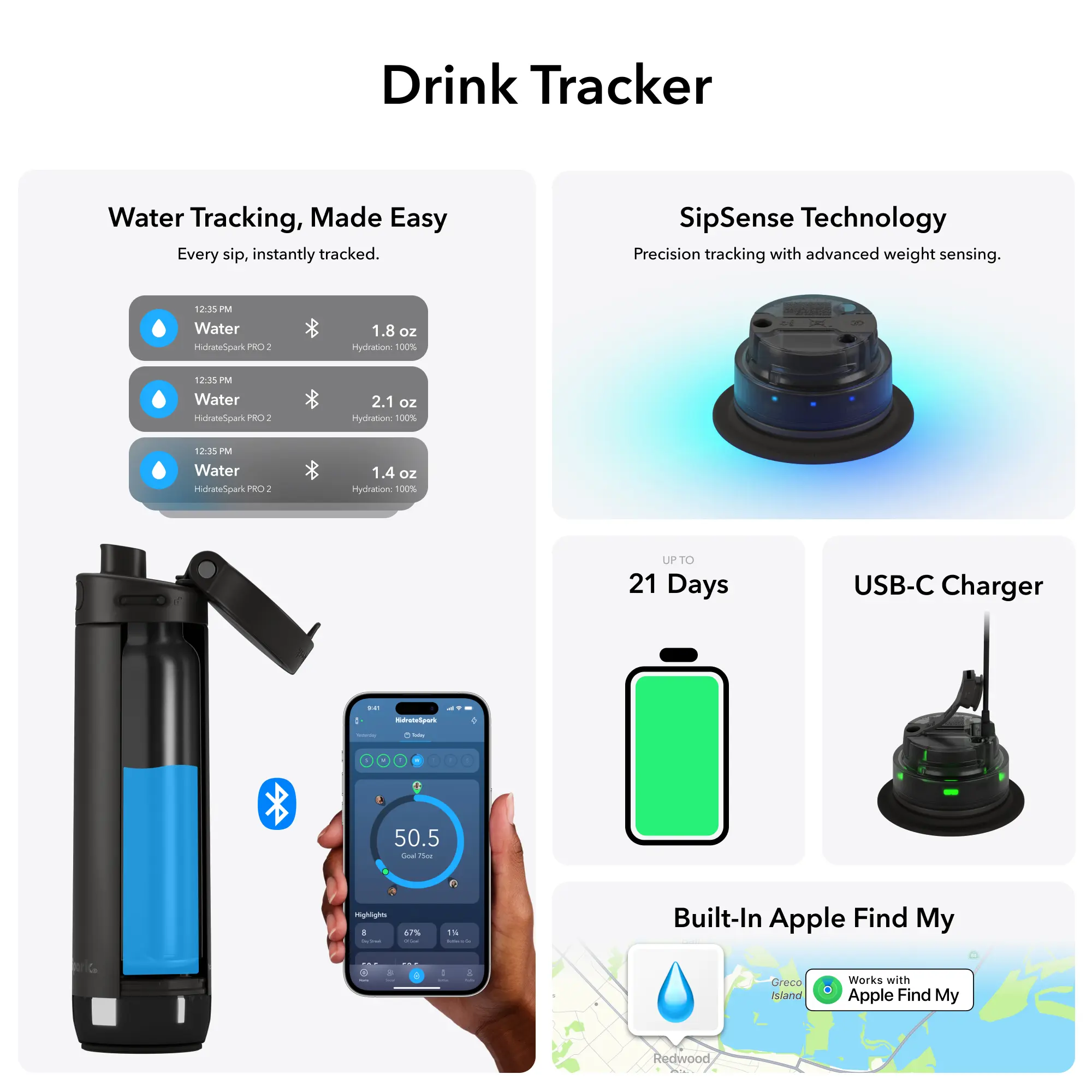 ·Drink Tracker – SipSense sensor automatically logs every sip and syncs to the free HidrateSpark app via Bluetooth.