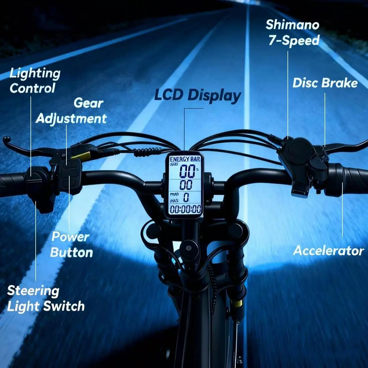 ·1500W Peak Motor: High torque for thrilling acceleration, reaching 34MPH. Shimano 7-Speed Gears handle city streets, mountain trails, off-road paths, and snowy terrains effortlessly.