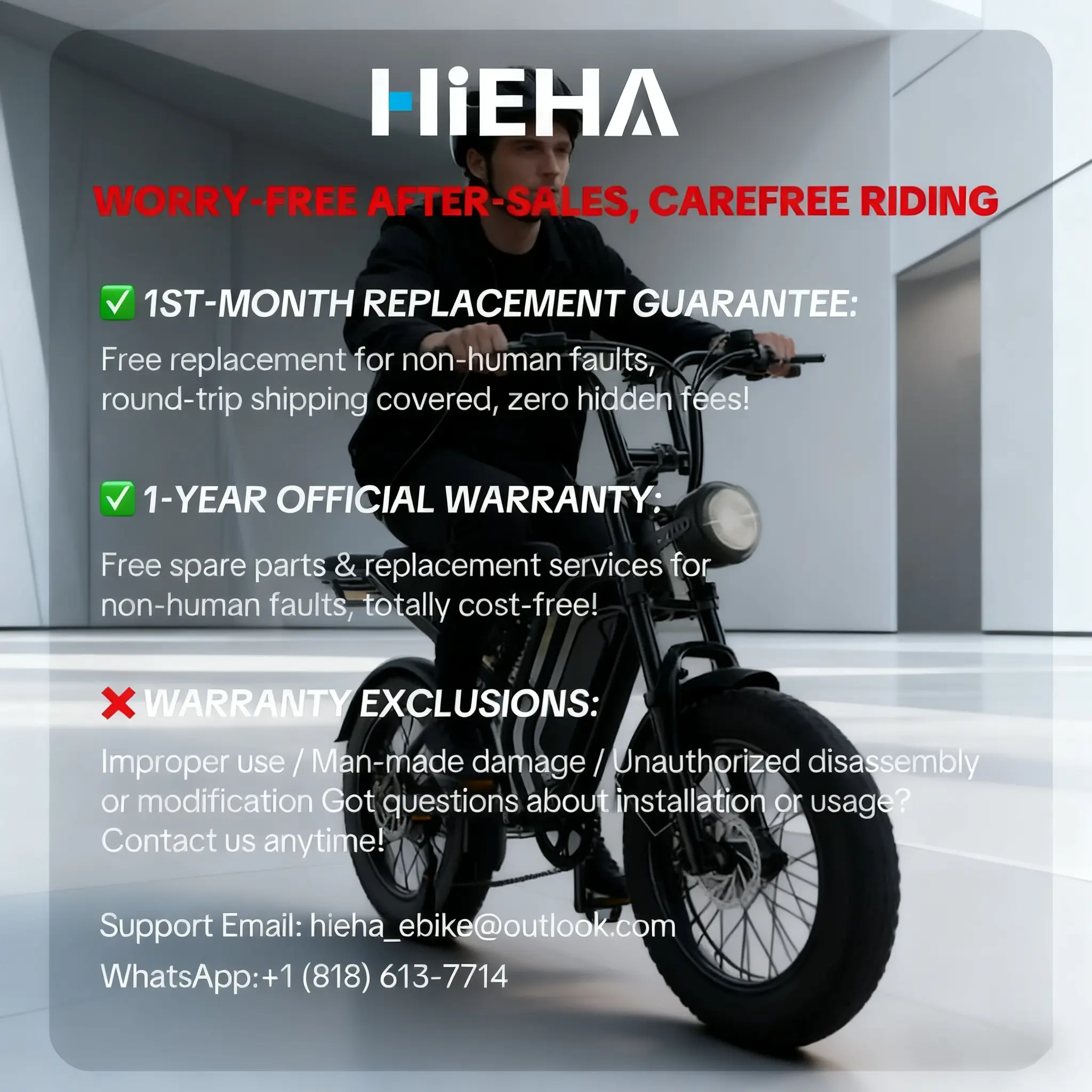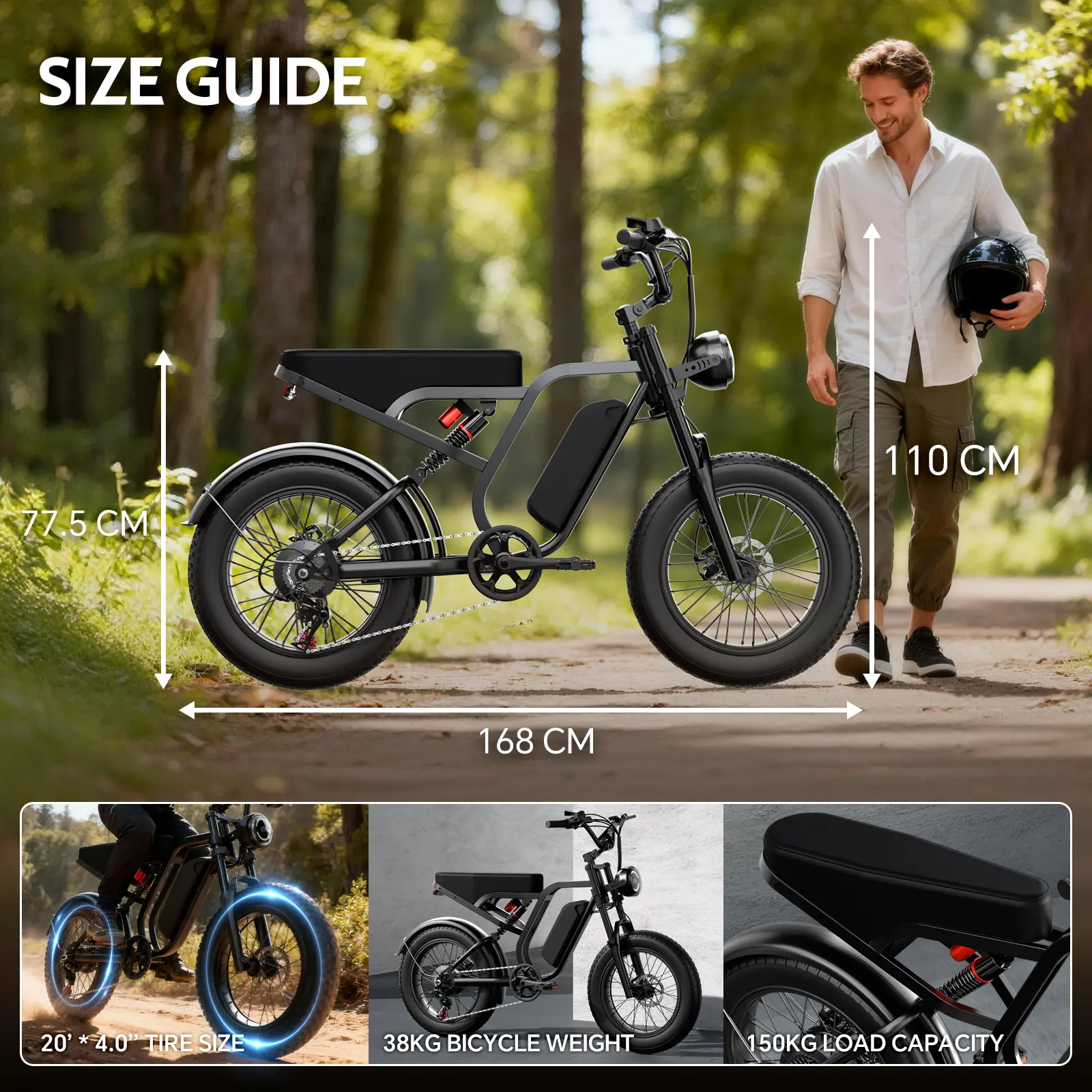 ·20"×4.0" Fat Tires: Extra-wide tires for superior traction and stability on sand, snow, mud, or rough roads. Adjustable dual shock absorbers + full suspension for a smooth ride.