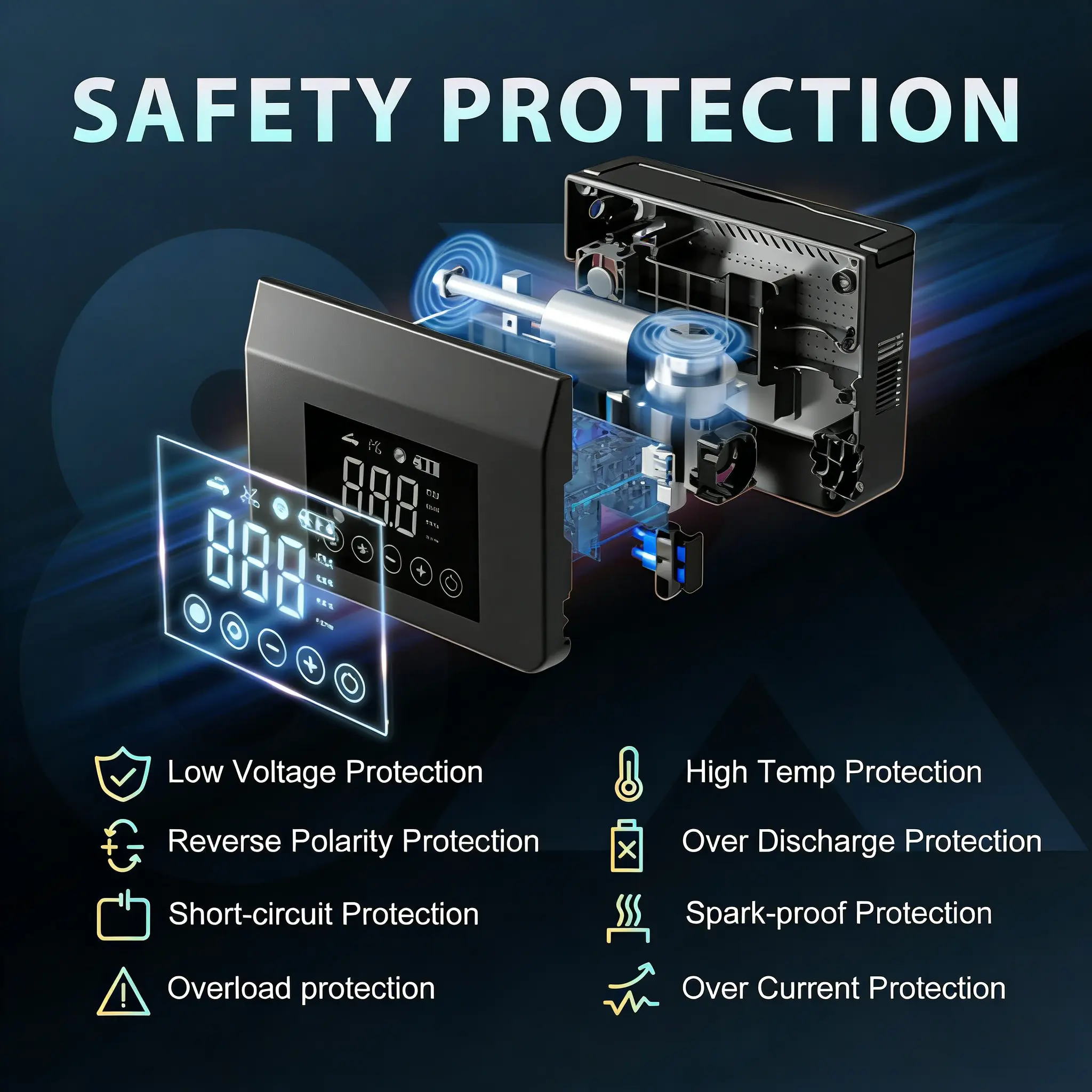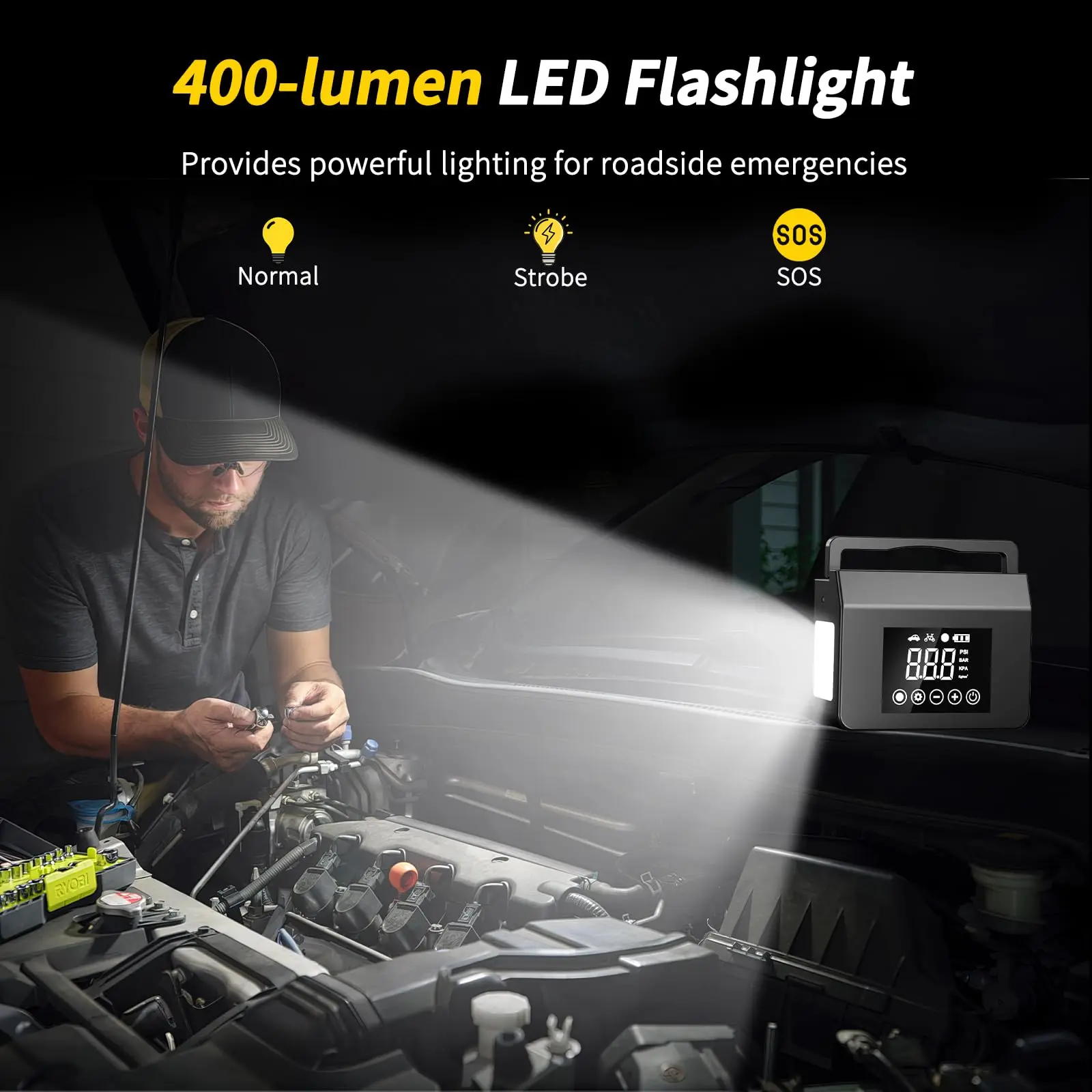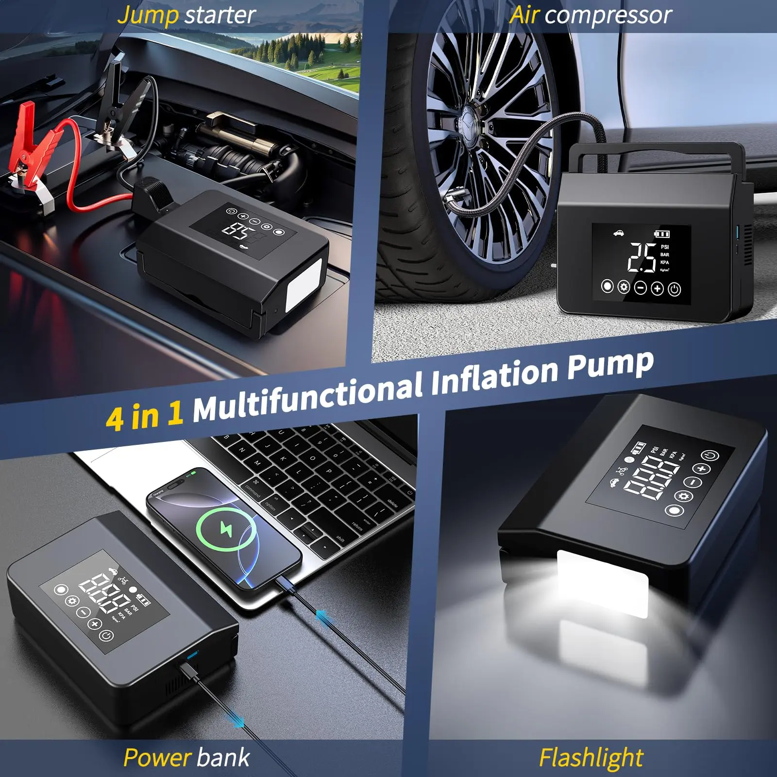 ·【Smart Cordless Inflator with LCD Display】The car jumper starter supports smart preset & auto shut-off without repeated adjustment and check. With unique turbocharged 8L/Min (150 PSI) lasting 6 minutes, jump starter provides fast and proper inflation to various tires, balls, etc. Friendly design with real-time data reading, detachable extended air hose and 3 optional unit switching for covenience.