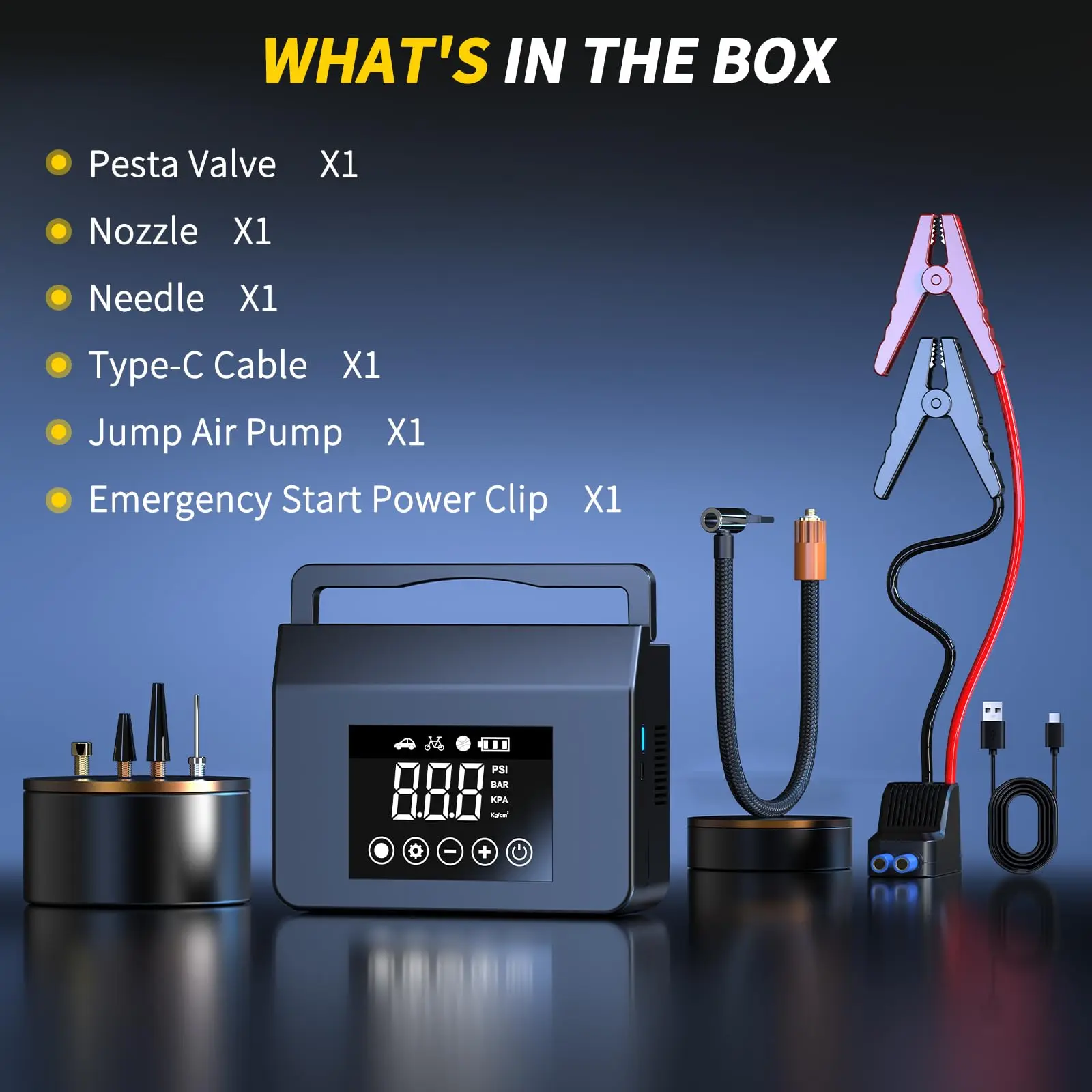 ·【WHAT YOU GET】 1 x Smart Air Pump, 1 x Air Tube(60cm/23.6in), 1 x Inflating Needle, 1 x Inflatable Nozzle, 1 x Pesta Valve, 1 x Emergency Start Power Clip, 1 x Type C Cable, 1 x User Manual. 18 months warranty and lifetime tech support. If you have any after-sales questions about jump starter, please feel free to contact us.Note: Please do not use the air pump function continuously over 6 minutes. When the tire battery compressor is seriously hot, please cool down for a few minutes before continuing to inflate the tire.