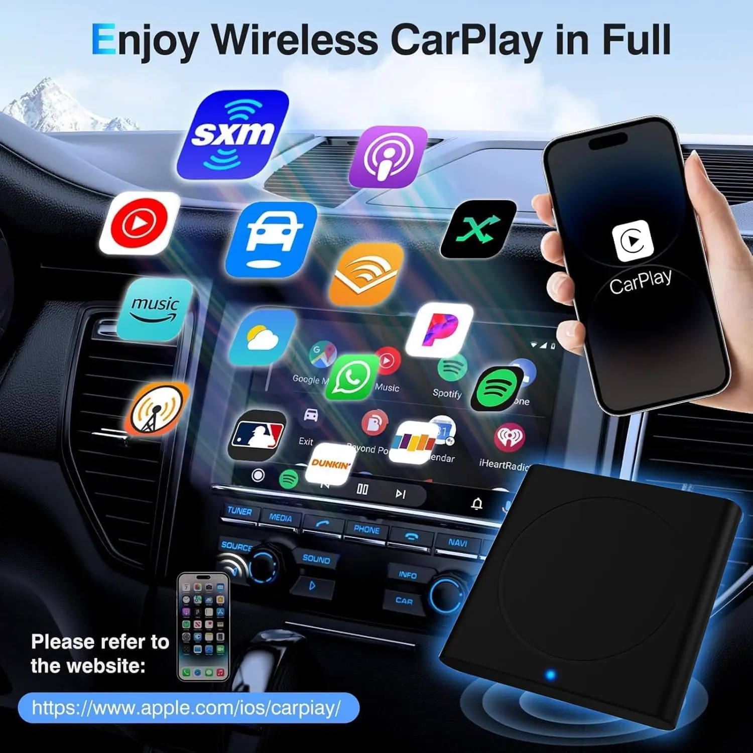 ·【Even Wider Compatibility】:The Wireless CarPlay dongle compatible with more than 600 car models. Compatible with: Ford Chevrolet Toyota Subaru Jeep Honda Nissan Cadillac RAM mercedes Peugeot Lincoln Volkswagen Volvo Mazda Porsche Benz etc. *Your car must have a factory wired CarPlay system in order to work with this adapter.