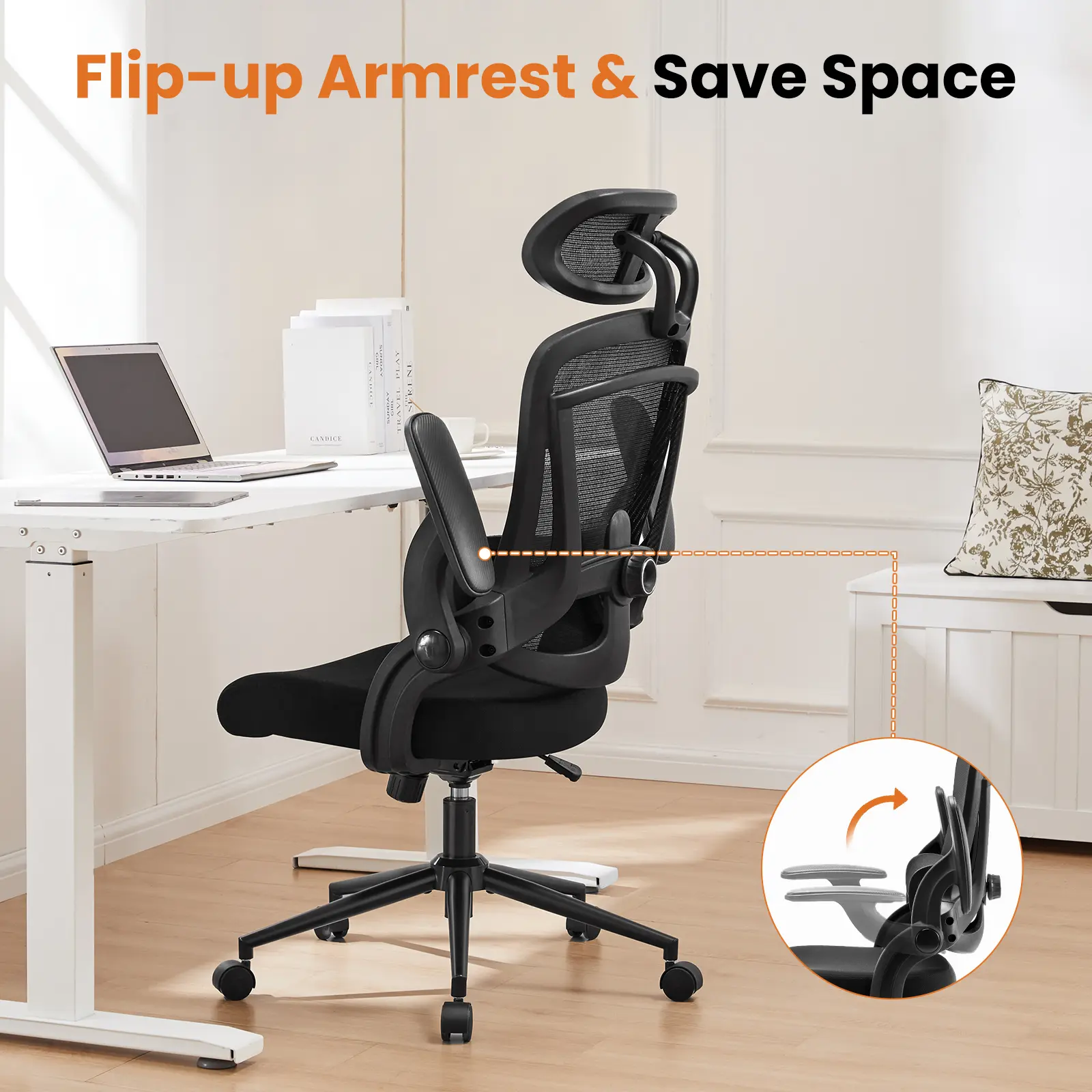 【Space-Saving】- Flip-up armrests are available and won't be in your way when not in use. The Armrests of the computer chair provide comfortable support for your arms and can be flipped up to save space effectively while not in use.