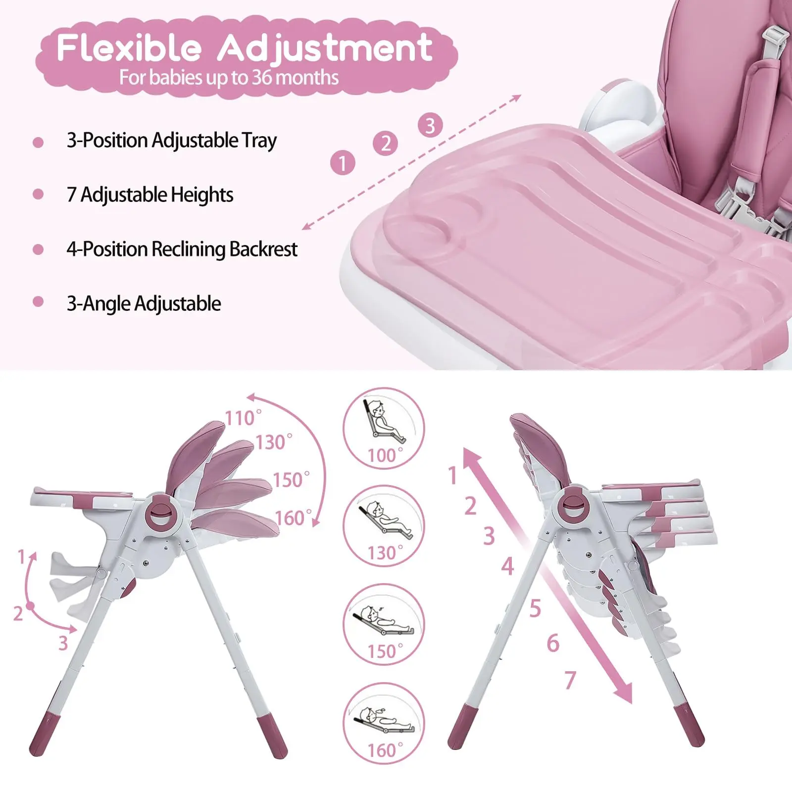 Discover the perfect blend of functionality and style with our adjustable high chair, designed to accommodate your baby from infancy through toddlerhood.