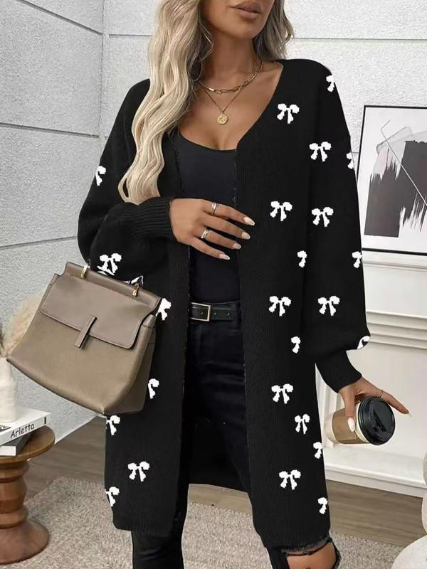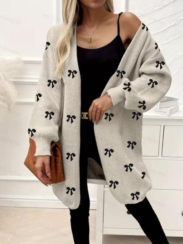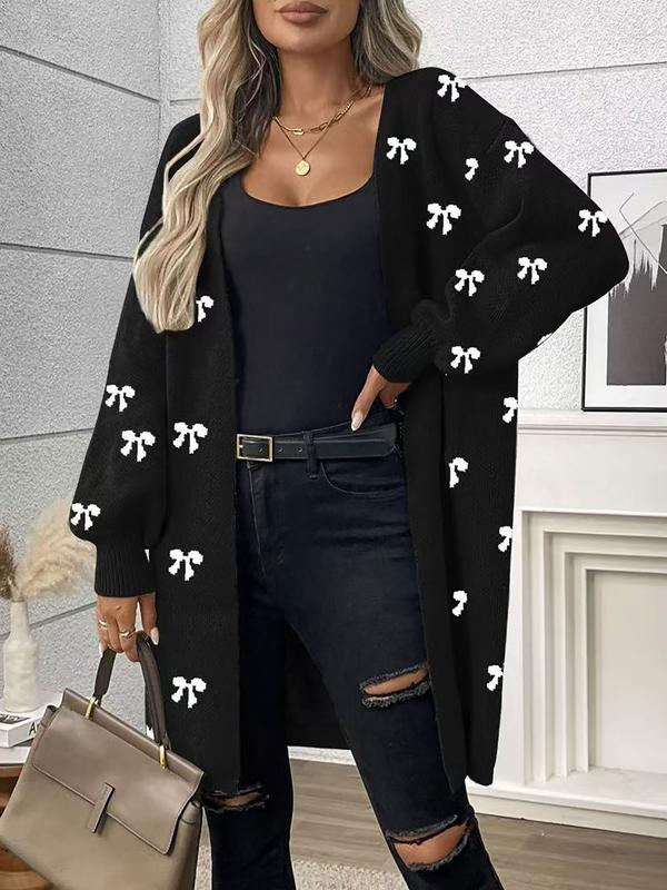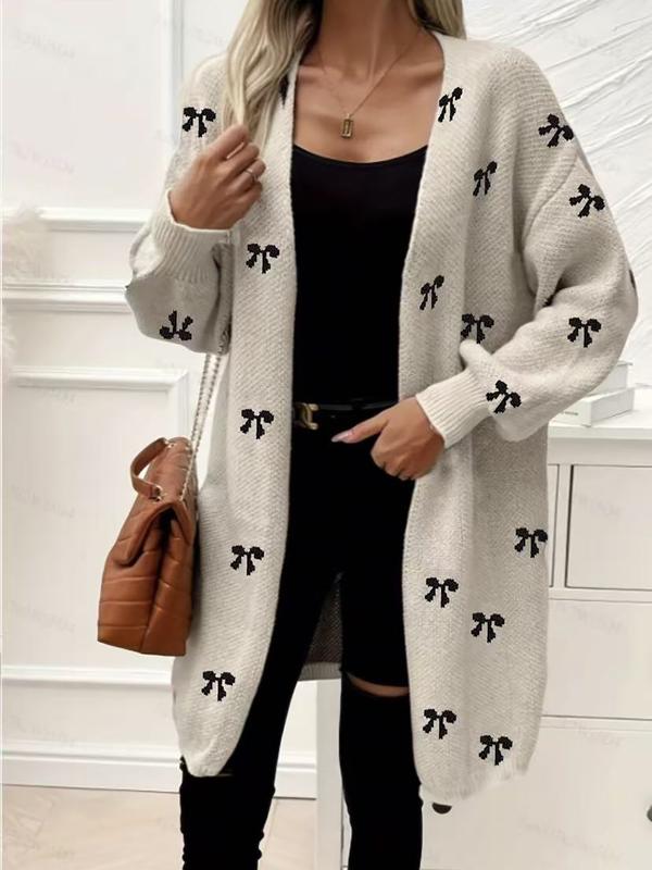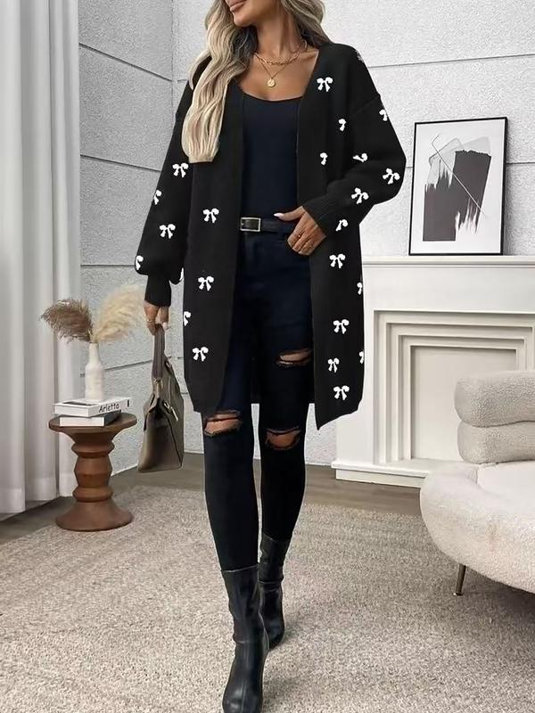 5. Autumn Winter New High-End Bow Pattern Knit Long Cardigan Sweater, Casual Versatile Outerwear, Elegant Lazy Style, Comfortable Color Block Design, Knitwear
