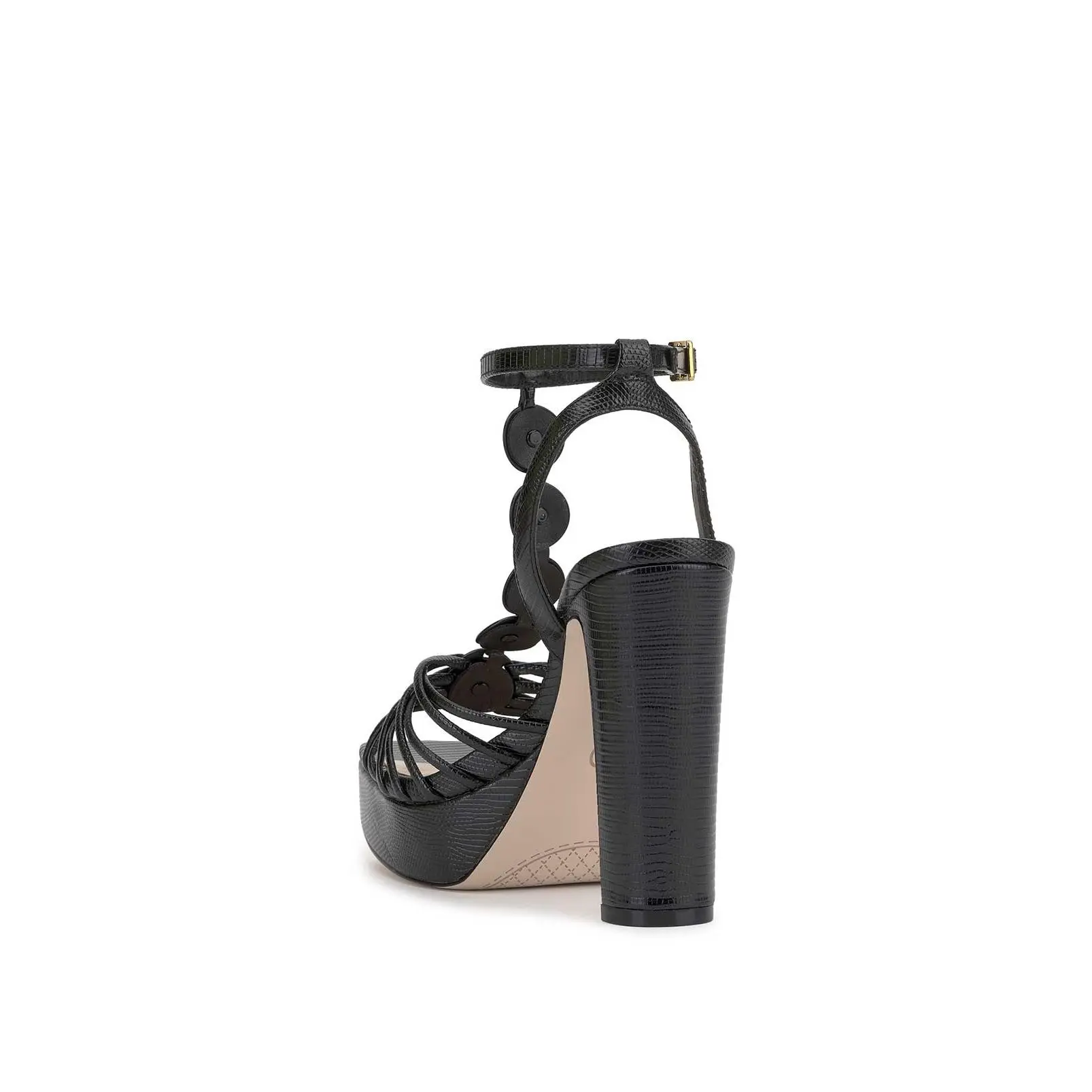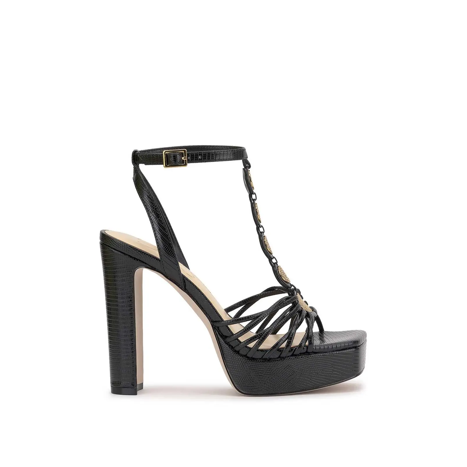 This stunning platform heel is designed to turn heads. Featuring a high block heel and a supportive platform sole, it offers both height and comfort. The intricate strappy upper is complemented by an eye-catching T-strap adorned with dazzling embellishments, adding a touch of glamour. An adjustable ankle strap ensures a secure fit, making it the perfect choice for special occasions, nights out, or adding an elegant statement to any outfit!