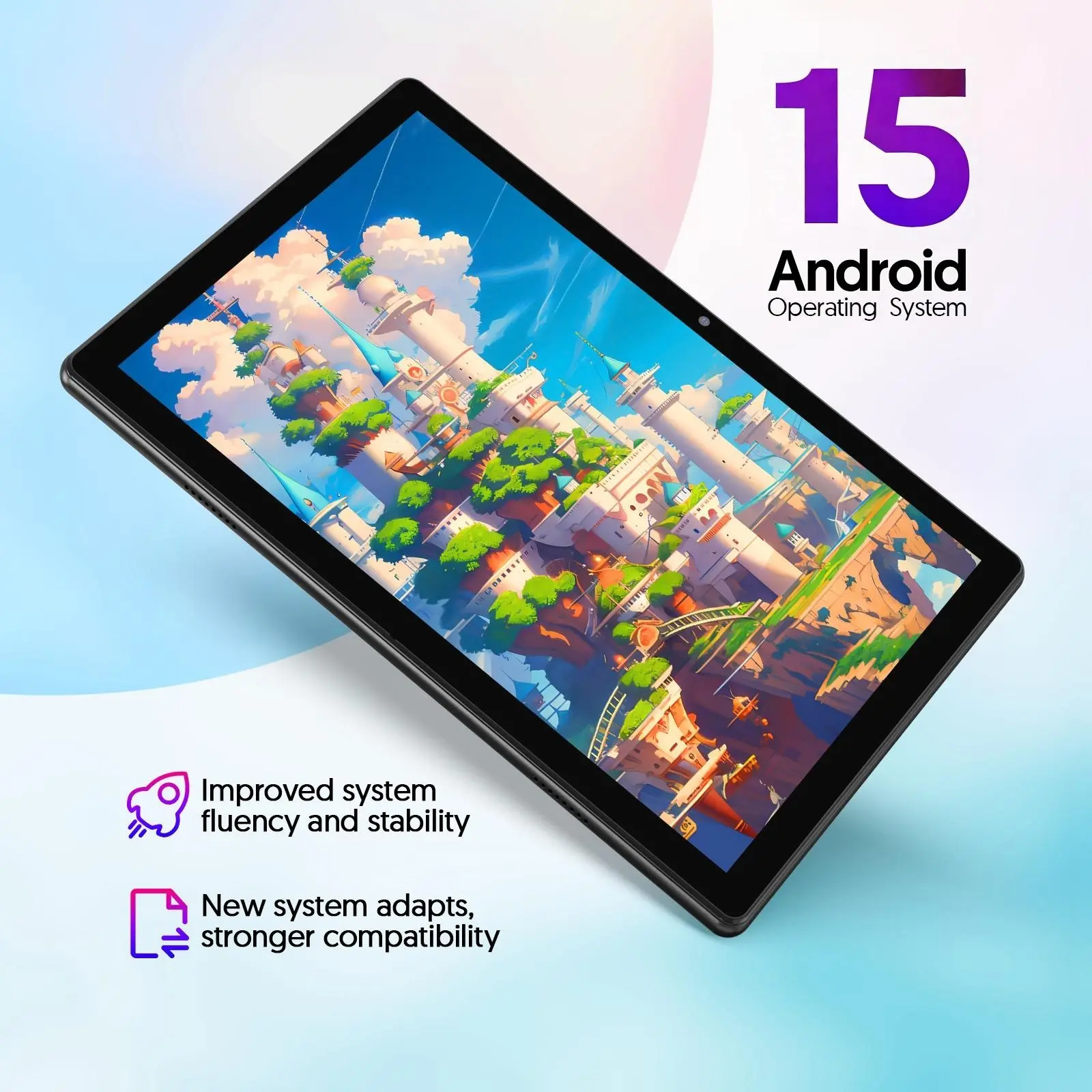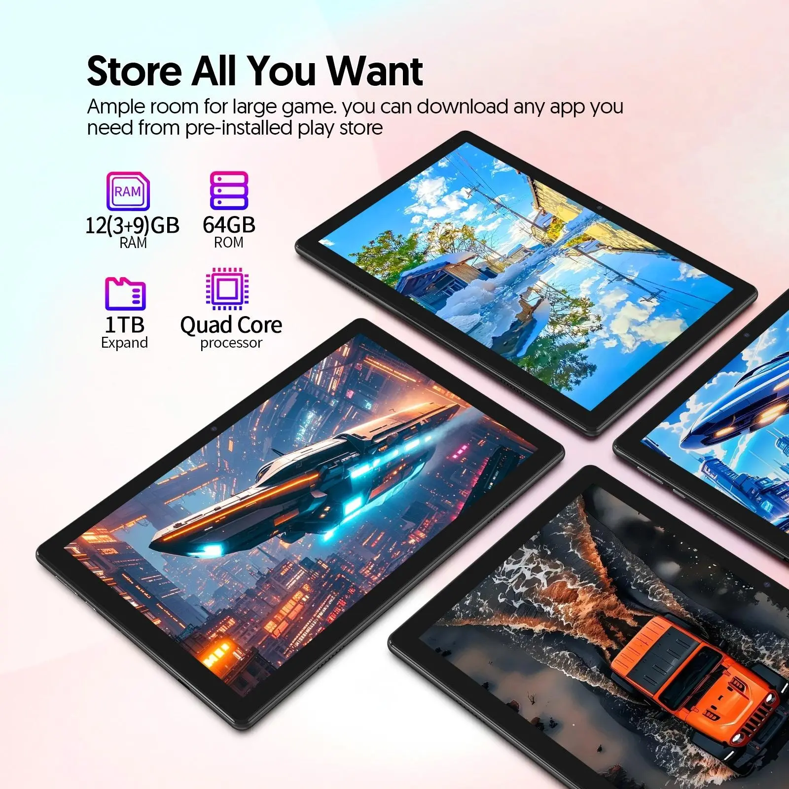 Android 15 Tablet PC, 10-Inch Quad-Core Cpu, 12gb RAM (3+9 Expansion) + 64GB + 1tb Storage, HD IPS Display, Wi-Fi6, Dual Camera, 6000mah Battery