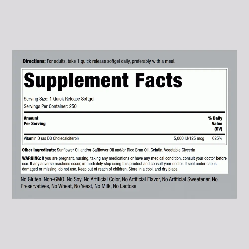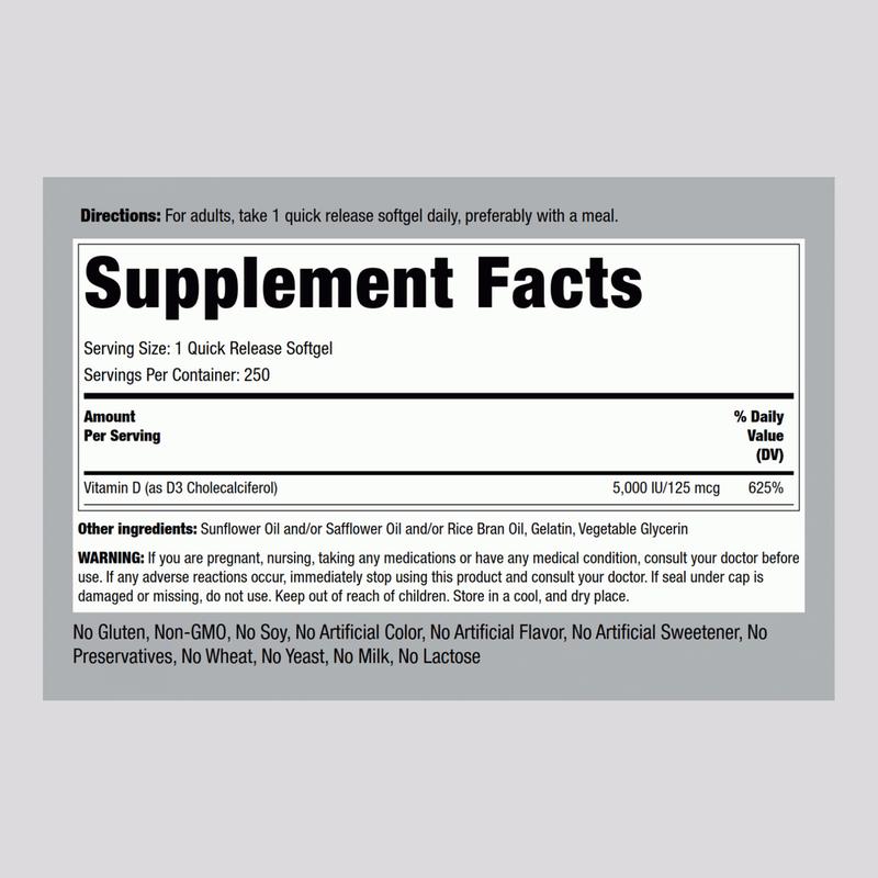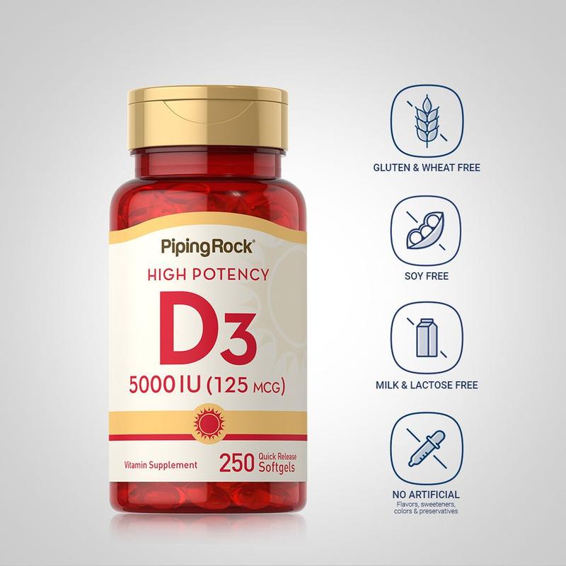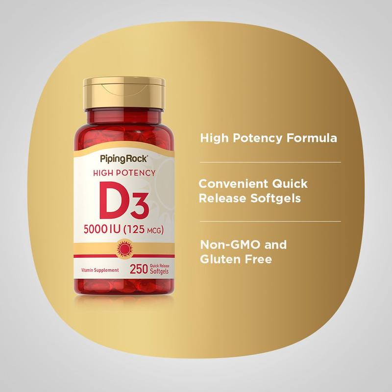 To ensure your levels are always optimal, Piping Rock's High Potency Vitamin D3 provides a convenient way to intake this substance daily. Supplying you with 125 mcg (5000 IU) per quick-release softgel, you can rest assured, sun or not, you’re covered.