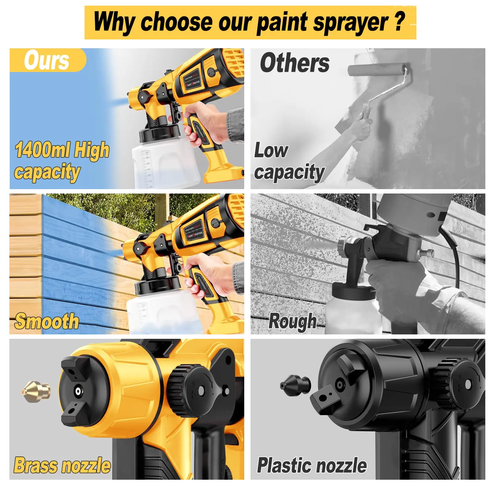 Paint sprayer tool:Advanced technology & careful design:The Paint Sprayer,operating at 1000 W with a large capacity container,boosts painting efficiency;Its adjustable flow control suits different tasks,offering a faster,more convenient alternative to rollers and brushes