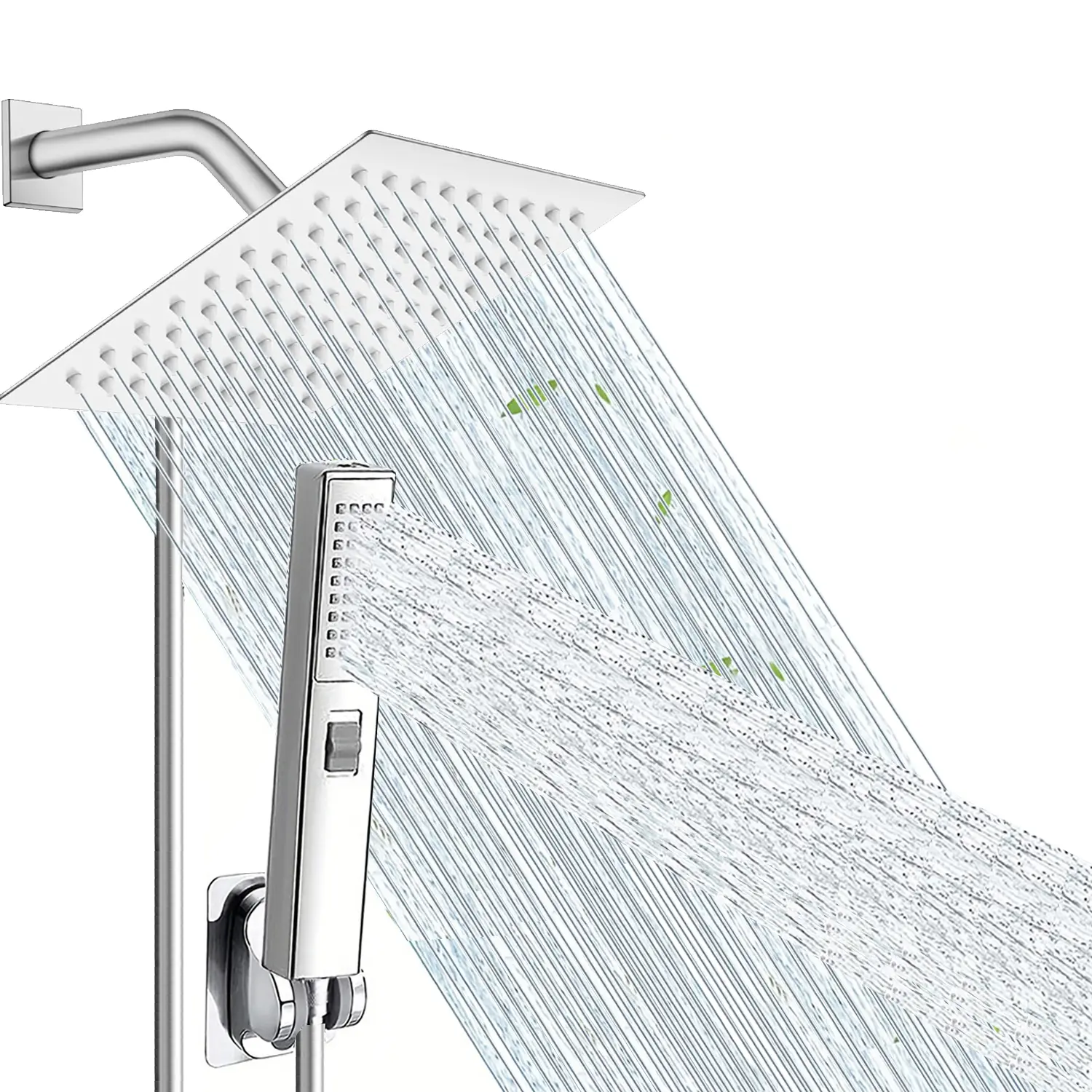 ·【PACKGE INCLUDED】8'' Rainfall square shower head & handheld shower head with holder, water flow regulator, 78'' shower hose, Adhesive Shower Head Holder, teflon tape, shower hook and user instruction. We stand by our shower heads with our outstanding customer service, if you ever have a problem, don't hesitate to contact us.
