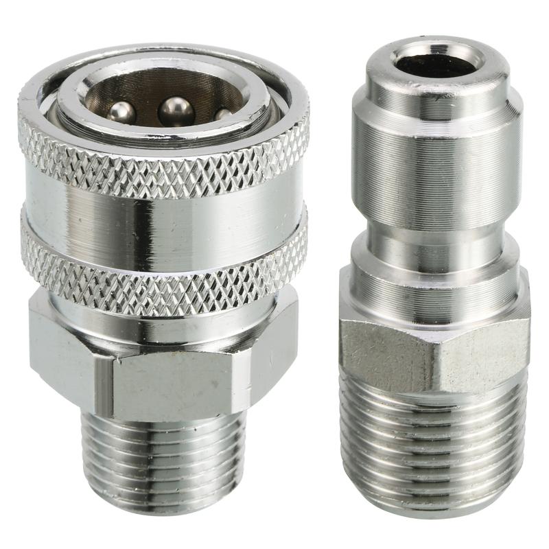 ·High pressure ball valve kit includes a ball valve and two adapters. The adapter set converts 3/8” quick coupler plug to 3/8” male NPT thread and 3/8” quick coupler socket to 3/8” male NPT thread.
