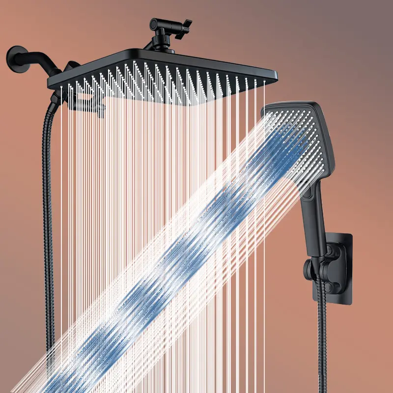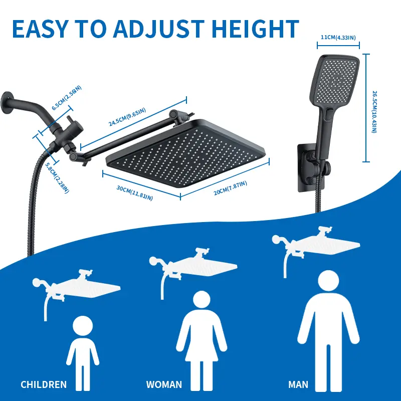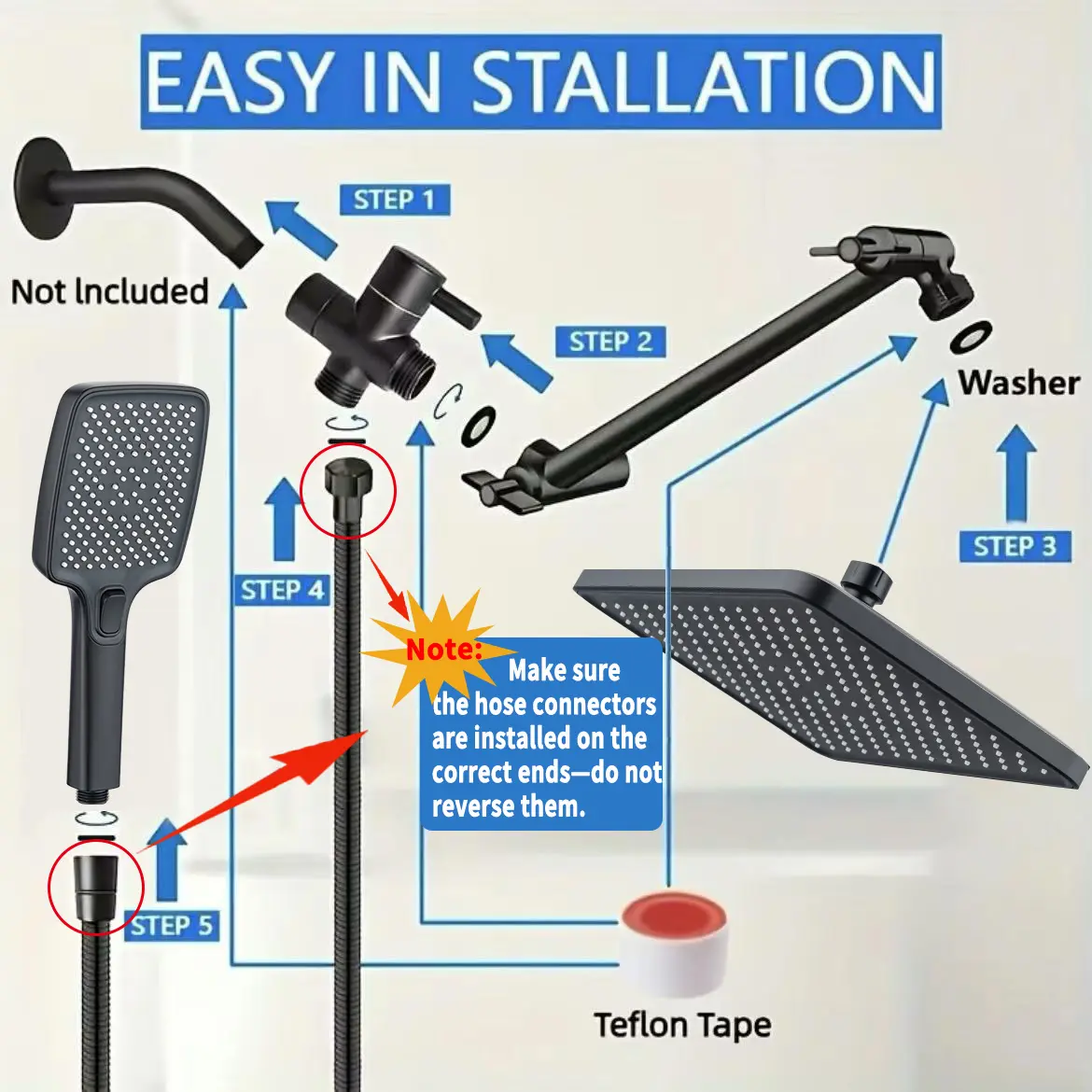 ① Excellent Shower Head Combo: This shower combination with 11.8 inch large square high pressure rain shower head, dual showerhead combo with 3-mode handheld spray, 9.65" extension arm, 59" hose, showerhead holder, 3-way water diverter, leak-proof washer,teflon tape, simple installation, easy to use.